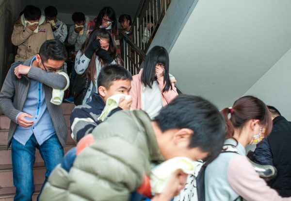 15时30分,演练正式开始。嘉园3号学生公寓东北侧430寝室冒出滚滚浓烟,公寓管理人员第一时间报告火情后,迅速切断非消防电源,开启所有通道大门及窗户,组织疏散学生。保安人员利用消火栓、灭火器控制火势,并引导学生有序疏散。同学们用湿毛巾捂住口鼻,快速、有序从逃生口撤离到安全地点。
