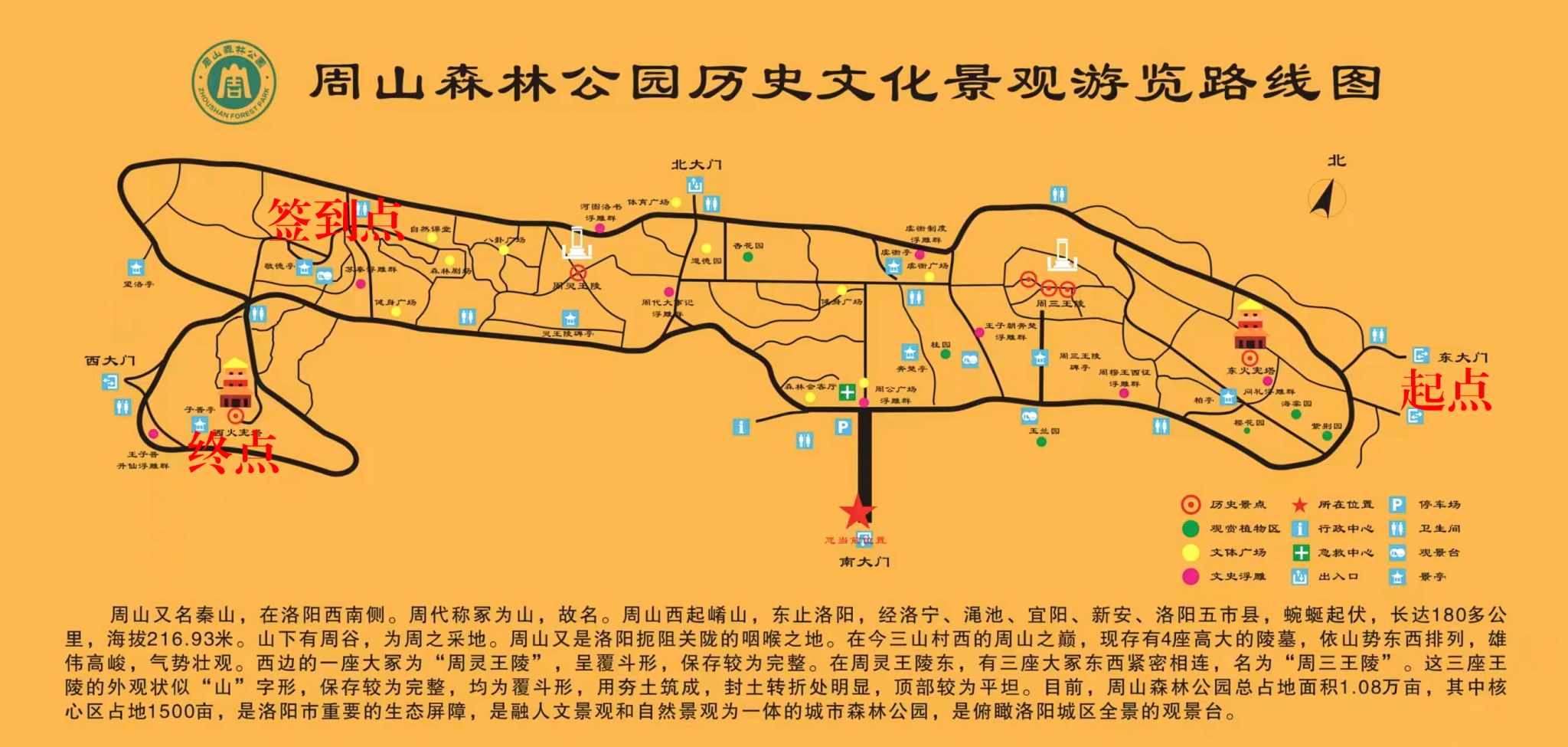 东起周山森林公园东入口(31路公交“周山大道乐山路口南站”向南100米路西)——向西至“敬德亭”(签到点)——终点“子晋亭”。