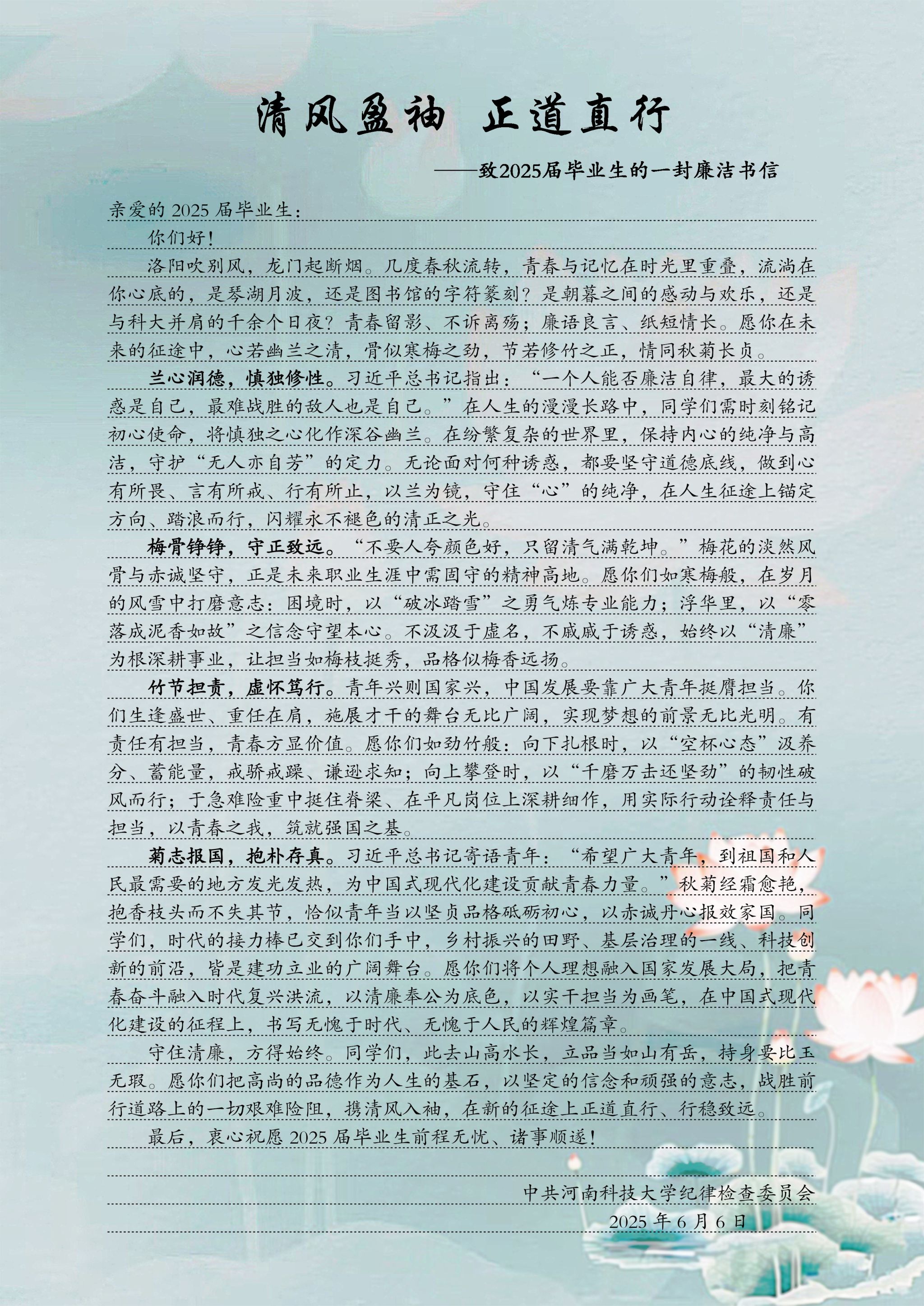 清风盈袖 正道直行——致2025届毕业生的一封廉洁书信
