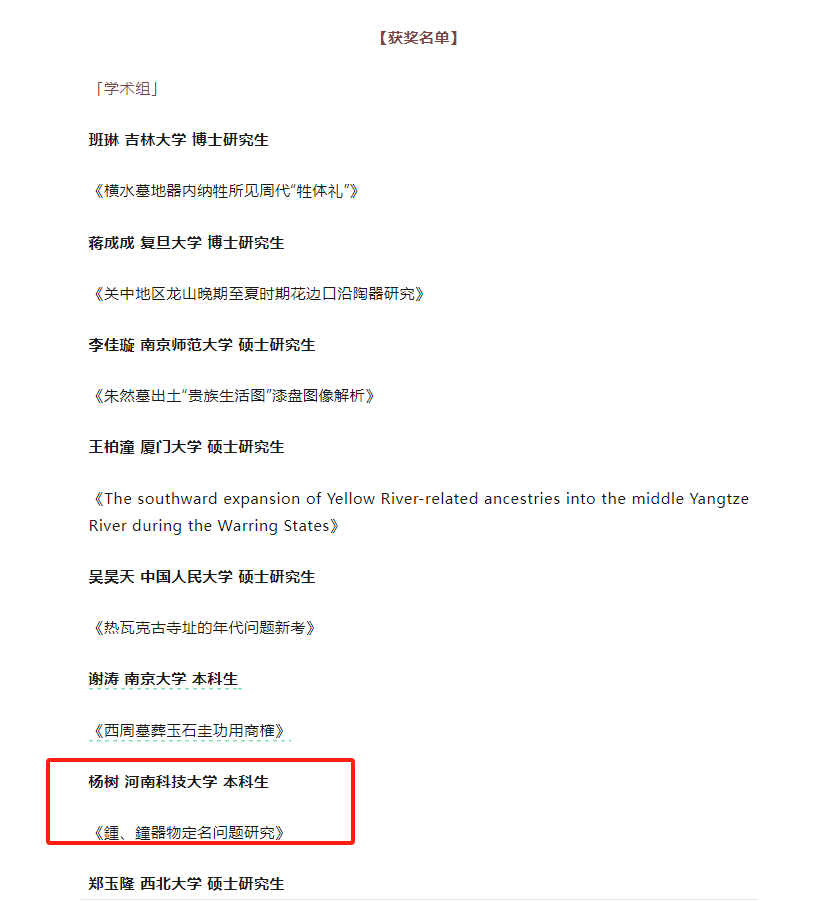 校新闻中心讯 3月27日,第十三届“发现中国李济考古学奖学金”获奖结果正式公布,我校人文学院考古学专业2021级本科生杨树申报的《鍾、鐘器物定名问题研究》获学术组奖项,这是我校首次获得李济考古学奖学金。