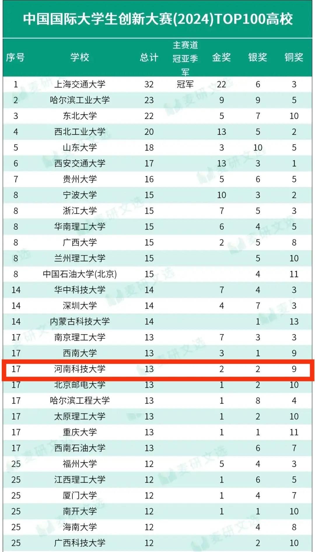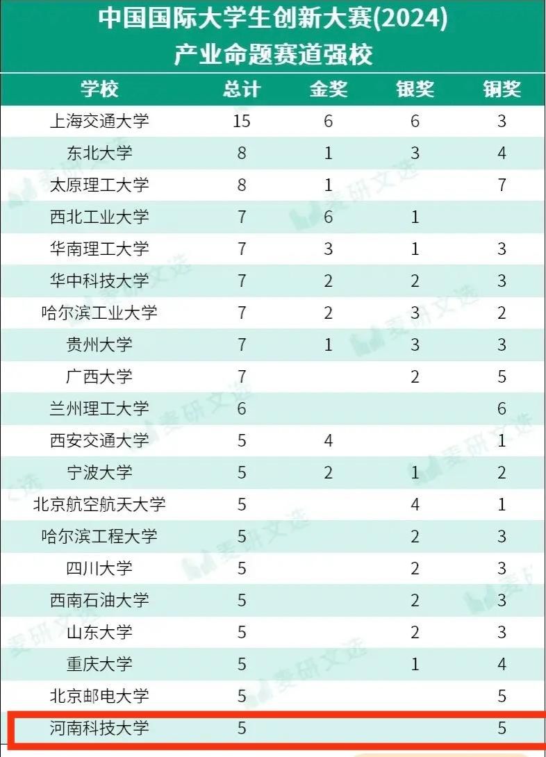 校新闻中心讯 近日,教育部正式公布中国国际大学生创新大赛(2024)获奖名单,我校以全国高校第17名的优异成绩刷新历史纪录。本届赛事我校共斩获金奖2项、银奖2项、铜奖9项,其中高教主赛道首次实现双金突破,获奖总数与质量稳居河南省高校首位。在产业命题赛道中,我校同样表现亮眼,摘得5项大奖,充分彰显创新创业育人成效。