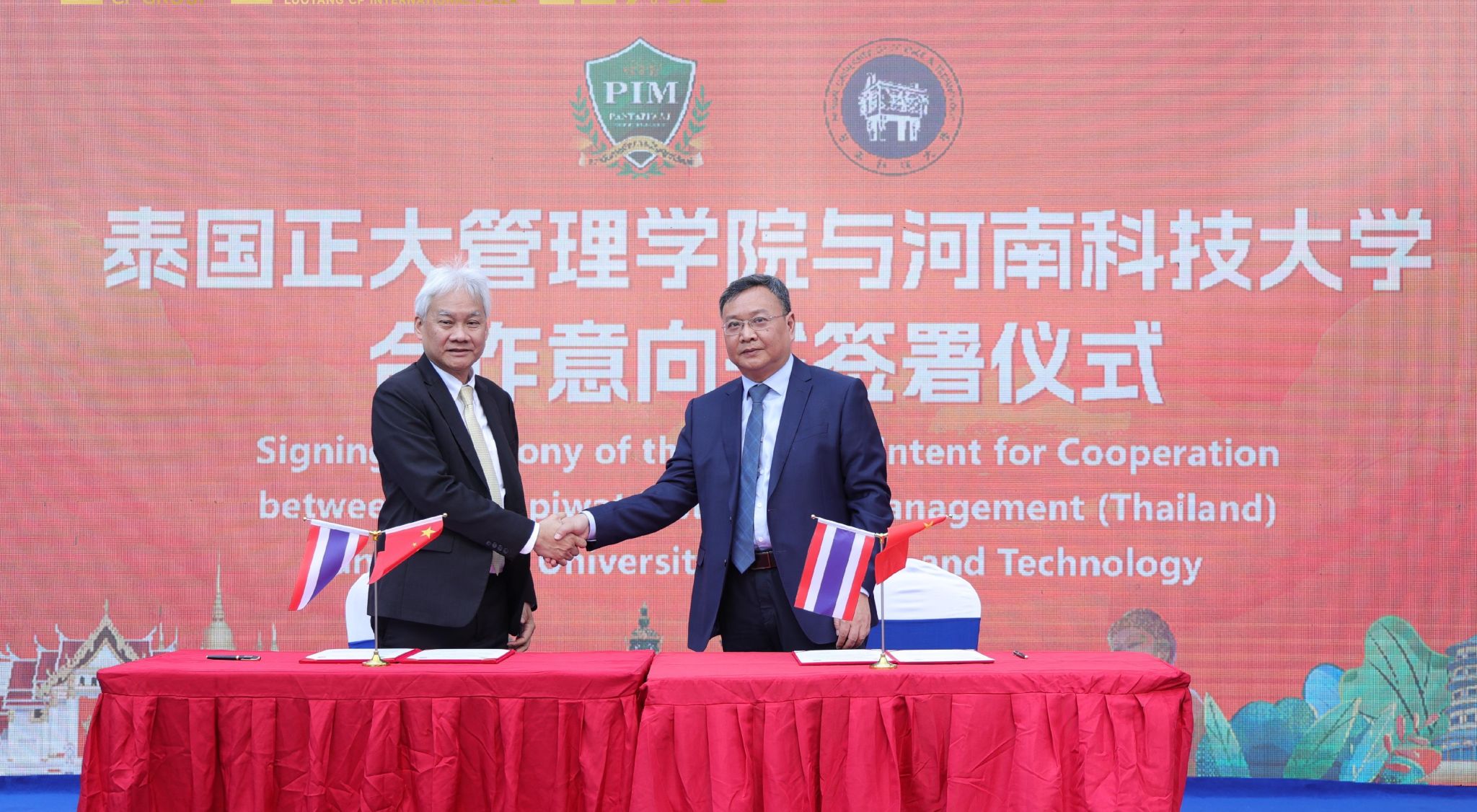 校新闻中心讯 5月28日,在中泰建交50周年暨“中泰友谊金色50年”之际,我校与泰国正大管理学院(Panyapiwat Institute of Management, PIM)成功签署合作协议。泰国驻华公使陈文斌、洛阳市市长张玉杰出席并见证签约。