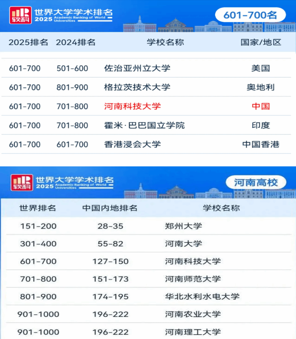 校新闻中心讯 8月15日,软科“2025软科世界大学学术排名”正式发布。我校在2025世界大学学术排名中排在世界第657名,中国第139名。相比2024年,我校的世界排名上升62名,中国排名上升4名,是近五年的最好表现。在省内上榜的7所高校中,我校稳居第三位。