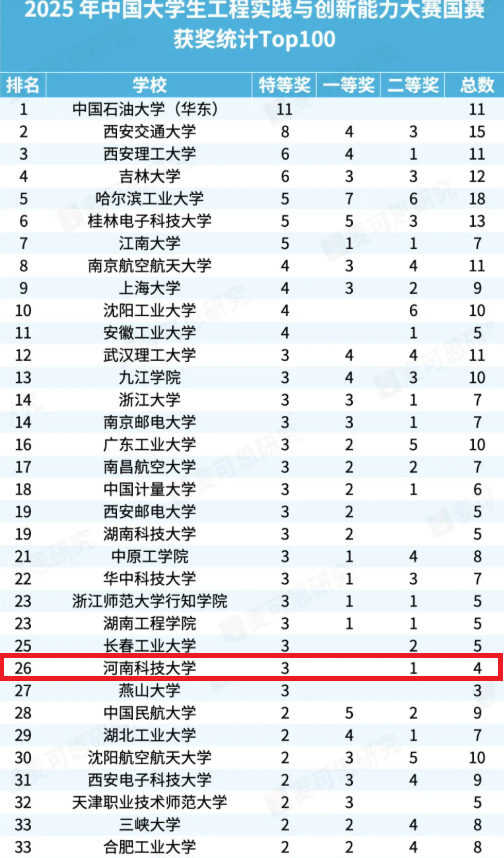 校新闻中心讯 近期,2025年中国大学生工程实践与创新能力大赛全国总决赛获奖名单公布,本次大赛获奖高校共计431所,我校位列全国26名。