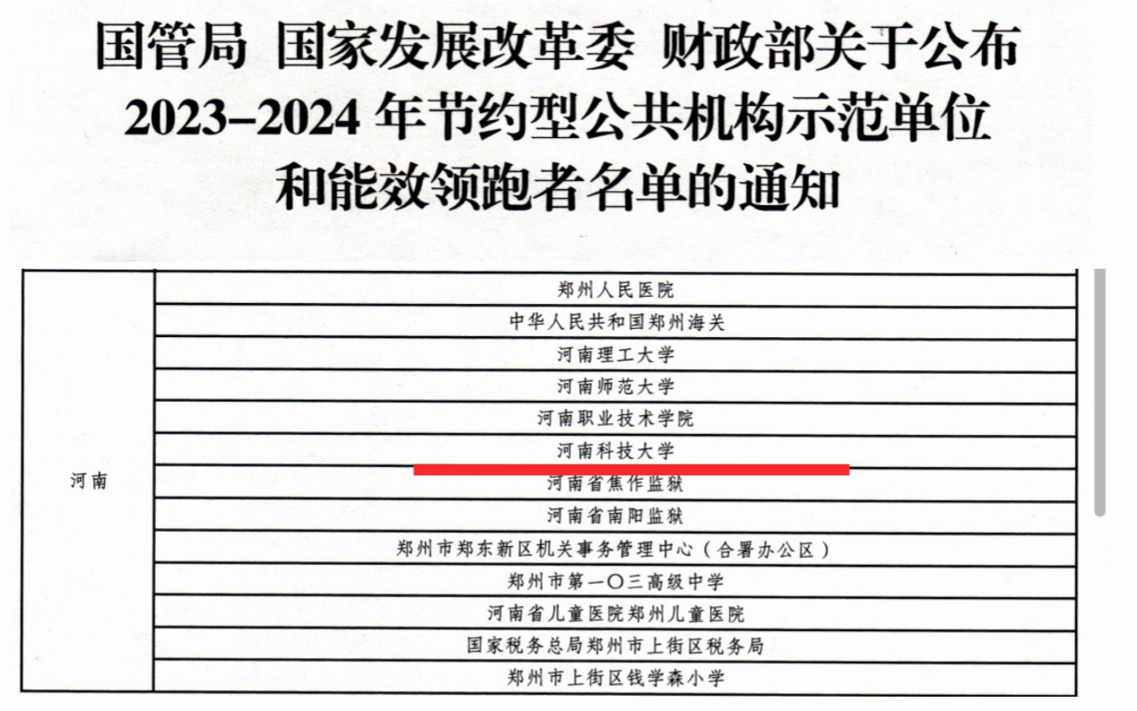 国管局、国家发展改革委、财政部组织各地区各部门开展2023-2024年节约型公共机构示范单位创建和公共机构能效领跑者遴选工作。我校经申报推荐、专家评审、线上答辩、现场核验等环节,获评为国家级节约型公共机构示范单位,河南省仅四所高校获此殊荣。