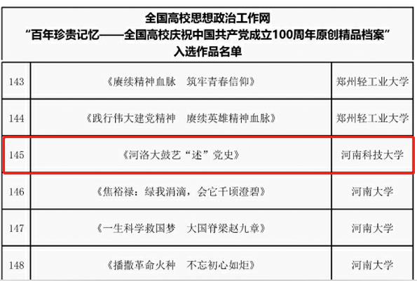 校新闻中心讯 近日,“高校庆祝中国共产党成立100周年原创精品推广行动”评审结果公布,我校原创作品《河洛大鼓艺“述”党史》入选《百年珍贵记忆——全国高校庆祝中国共产党成立100周年原创精品档案》。