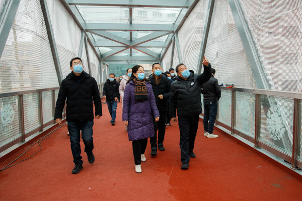 杨霞听取了老校区综合管理办公室主任陈玉浩对天桥建设情况的汇报,对市委、市政府及各参建单位克服重重困难顺利建成天桥表示诚挚感谢。她说,天桥的落成是我校师生盼望已久的一件喜事,天桥南北贯通不仅解决了西苑校区师生交通安全问题,更是对学校疫情防控、校园安全等起到了至关重要的作用。