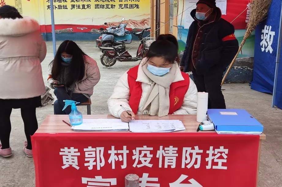 郭科文在她的家乡河南省周口市太康县黄郭村村口设卡点处提醒出入村庄的人下车扫码测量体温并登记信息。在了解到所在村委招收志愿者的消息之后,她和村里的几个大学生立即向村民委员会主任报到,听从村委的统一安排。每天早上八点到下午五点,准时来到村口设卡点,提醒出入村庄的人下车扫码,测量体温并登记信息,同时登记排查外来人员。