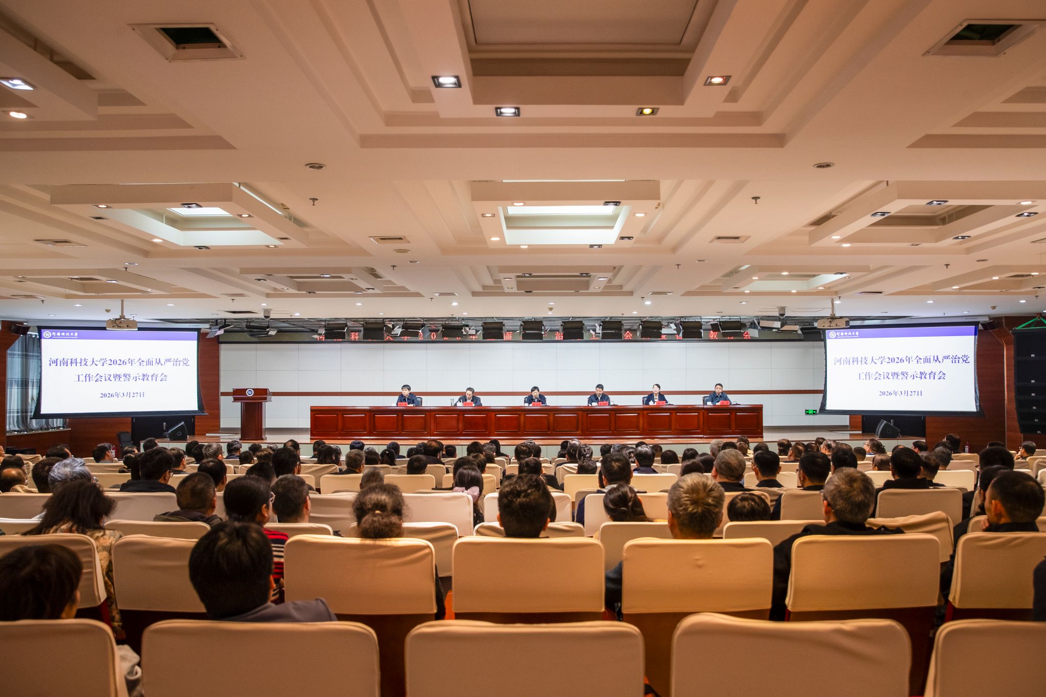 校新闻中心讯 3月27日上午,学校2026年全面从严治党工作会议暨警示教育会召开,省纪委常委、一级巡视员李成宽出席会议并讲话。校党委书记王洪彬安排部署2026年学校全面从严治党工作。校纪委书记、监察专员侯帅对今年纪检监察重点工作提出要求。省纪委监委第七监督检查室主任刘中元,洛阳市纪委副书记、市监察委员会副主任王鹏程到会指导。校党委副书记海然主持会议。