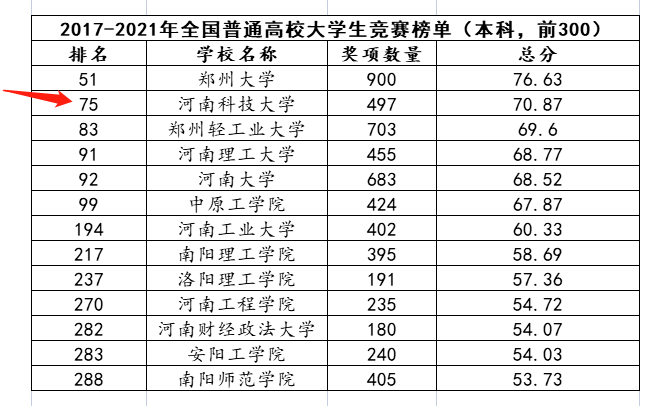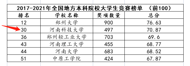 校新闻中心讯 近日,中国高等教育学会高校竞赛评估与管理体系研究工作组发布了2021年度全国普通高校大学生竞赛排行榜,在全国普通高校大学生竞赛六轮总榜单中,我校位列第105名,省内排名第三;在同时发布的2017-2021年全国普通高校大学生竞赛排行榜(本科)中,我校位列第75名,排名较2020年提升5位;在2017-2021年全国地方本科院校大学生竞赛排行榜中,我校位列第30名,排名较2020年提升5位。在以上两项排名中,我校均位居河南省高校第二。