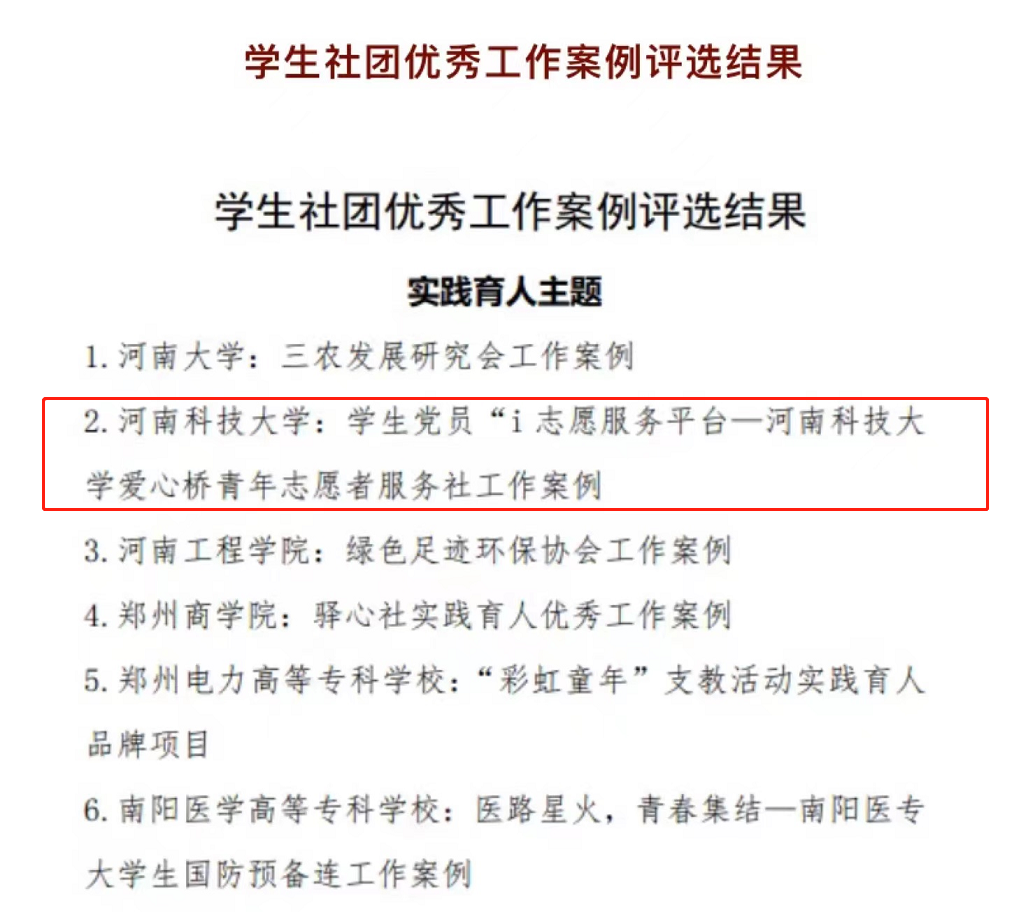 校新闻中心讯 近日,省委教育工委、省教育厅公布了2021年全省高校学生社团品牌建设系列活动遴选结果,我校车辆与交通工程学院的科技创新协会荣获创新创业类“十佳学生社团”荣誉称号,机电工程学院的学生党员“i志愿服务平台——正规博彩平台爱心桥青年志愿者服务社”工作案例荣获学生社团实践育人主题优秀工作案例。