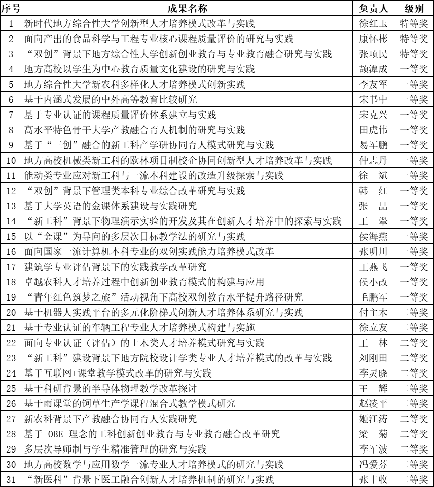校新闻中心讯 近日,河南省教育厅下发《关于公布2021年度河南省高等教育教学成果奖获奖项目的通知》,我校本科高等教育项目共获31项河南省高等教育教学成果奖,其中特等奖3项,一等奖16项,二等奖12项。