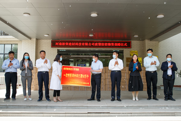 仪式上,杨霞介绍了此次捐赠的基本情况。河南浙荣建材科技有限公司一次性向我校捐赠50万只医用外科口罩。王洪彬向陈万松颁发捐赠证书。