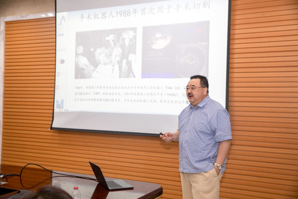 孟庆虎院士从后达芬奇无疤痕专科手术机器人、全骨科手术辅助机器人、无线胶囊内窥镜机器人和全自动智能交互核酸采样机器人4种典型的医疗机器人入手,系统介绍了相关机器人技术发展历程、带领团队所做技术创新、与现有最高水平技术的对比优势、带领团队产业化实践与成效等。报告会上,孟庆虎院士就智慧医疗和医疗机器人等问题与参会老师和研究生进行了深入的交流。