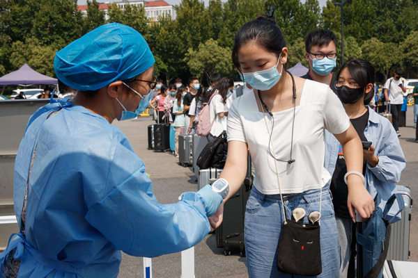 “欢迎同学回家,请登记后,有序进行核酸检测。”今年,学校特意在校门口为学生设置核酸检测通道,返校学生在经过扫码消毒、更换口罩、刷脸身份核实、登记报到、核酸检测后方可进入校园。