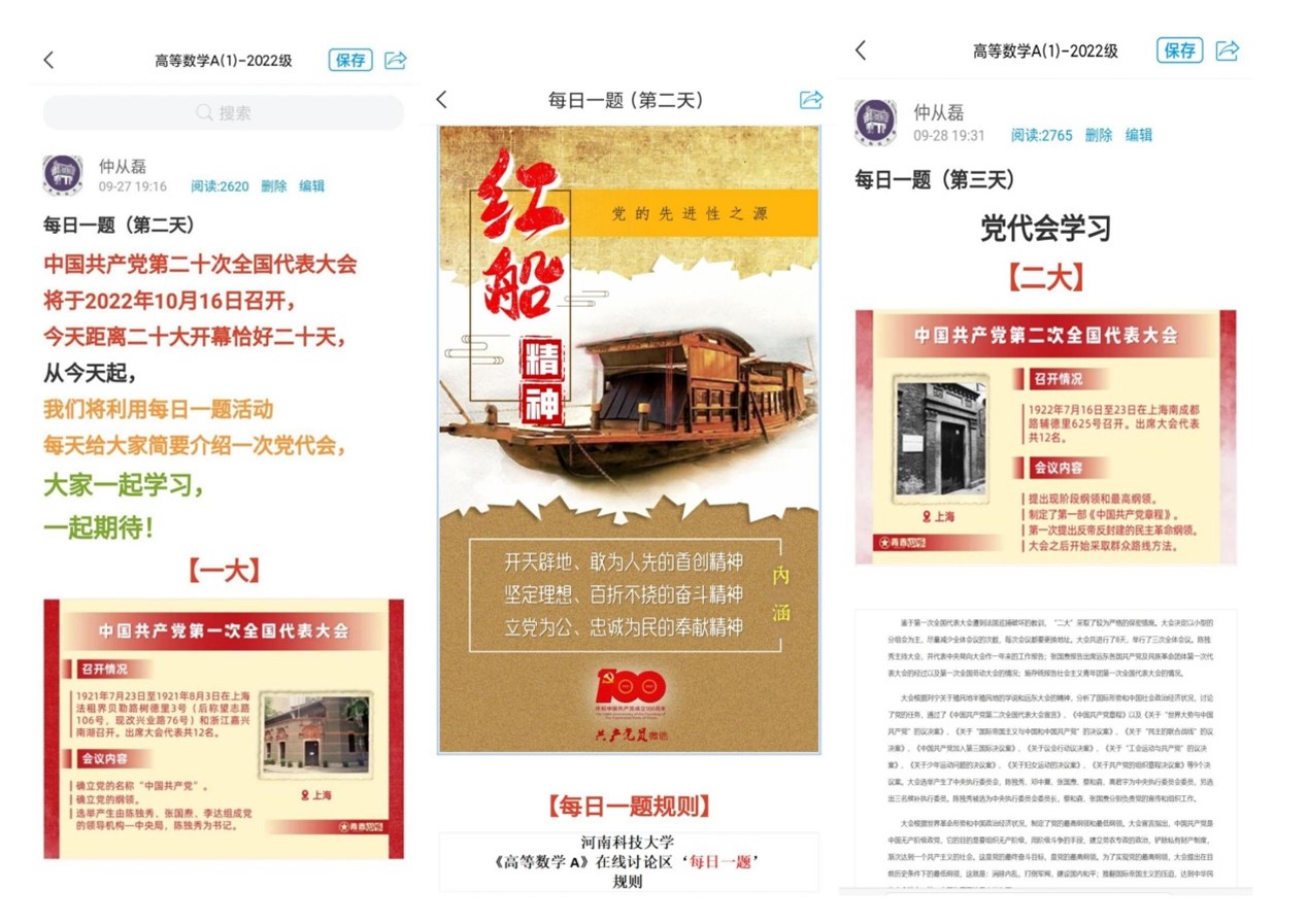 经过支部指导和党员教师的精心筹划,支部和教学组利用平台的讨论区固定活动《每日一题》学习讨论帖,专门设立《党代会学习》和《中国精神学习》两个板块,每天给学生简要介绍一次党代会,内容包括每一次党代会召开的时间、地点、参会党员人数,召开背景,主要内容,历史意义等。同时,按照时间顺序,向学生介绍红船精神、井冈山精神、抗洪精神、抗疫精神等“中国精神”。实现师生一起学习,本校和使用课程的外校师生一起学习,使学生在学习高等数学知识的同时,学习党代会和党史,深入了解“中国精神”,激发学生奋发学习的动力。