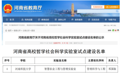 校新闻中心讯 近日,省教育厅发布了河南省高校哲学社会科学实验室试点建设公示名单,我校商学院牵头申报的“智慧农业工程与管理实验室”获得首批培育实验室建设支持。