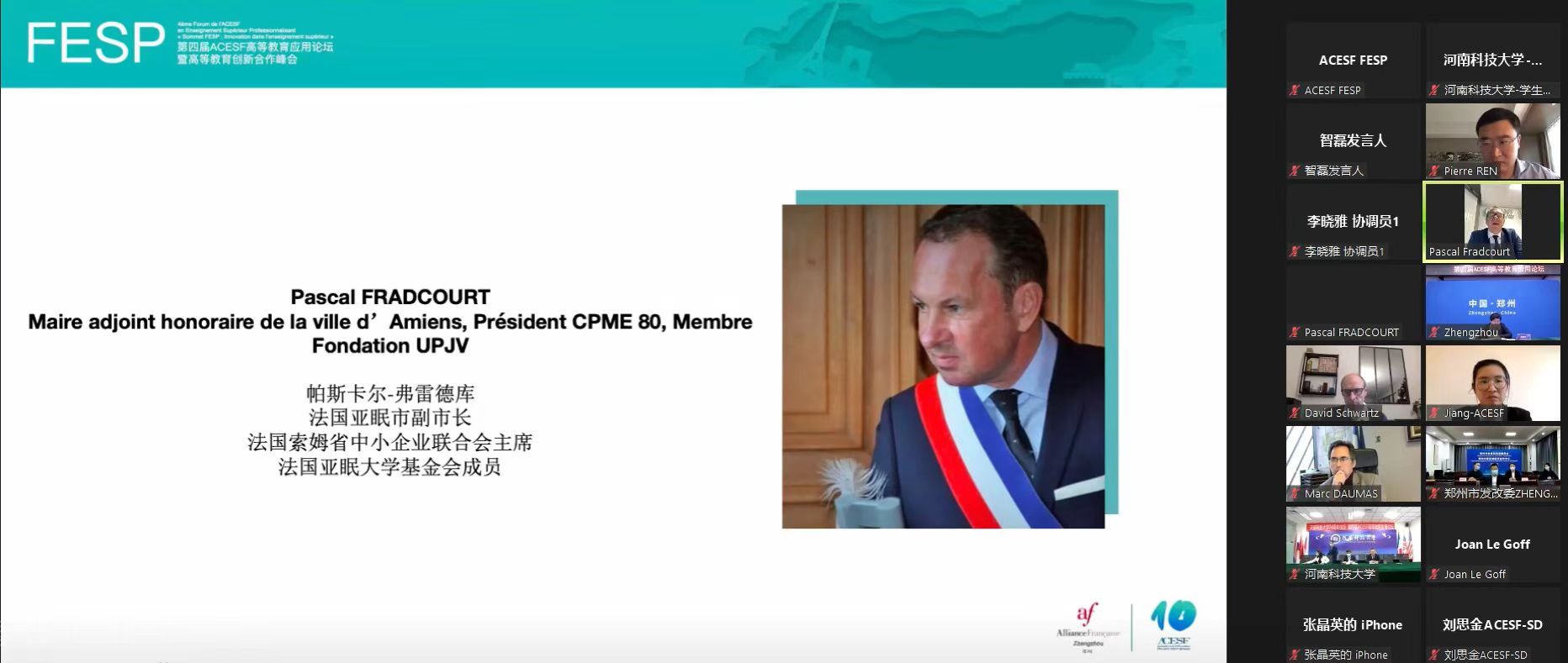 校新闻中心讯 11月24日下午,正规博彩平台建校70周年校庆国际论坛暨第四届ACESF高等教育应用论坛通过云视频方式隆重举行。法国亚眠市副市长帕斯卡尔·弗雷德库先生(Pascal FRADCOURT),法国驻华大使馆合作与文化行动司高等教育、研究与创新参赞杜马科先生(Marc DAUMAS),校党委书记王洪彬教授等出席会议。来自法国萨克雷大学、巴黎东大学、波尔多大学、山东第一医正规博彩平台学、郑州航空工业管理学院等30余所中法高校师生代表近千人线上参加论坛。论坛由法国中法教育交流协会主席任树磊先生和我校国际合作与交流部部长毛鹏军教授共同主持。