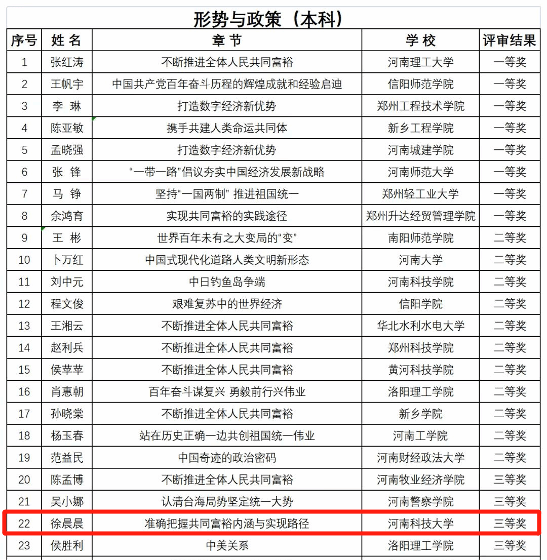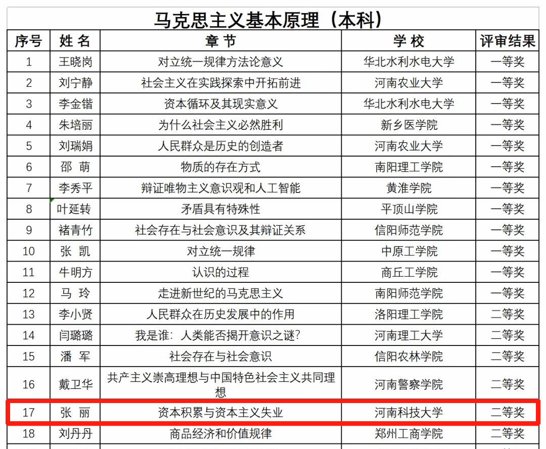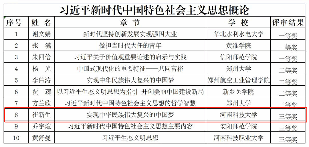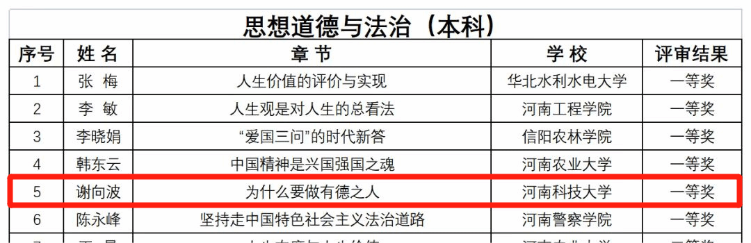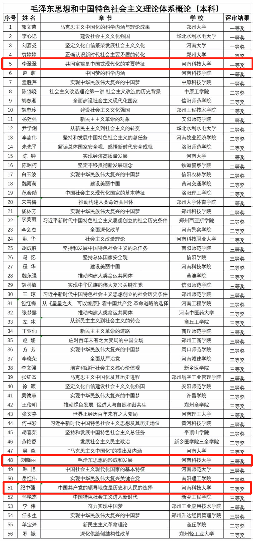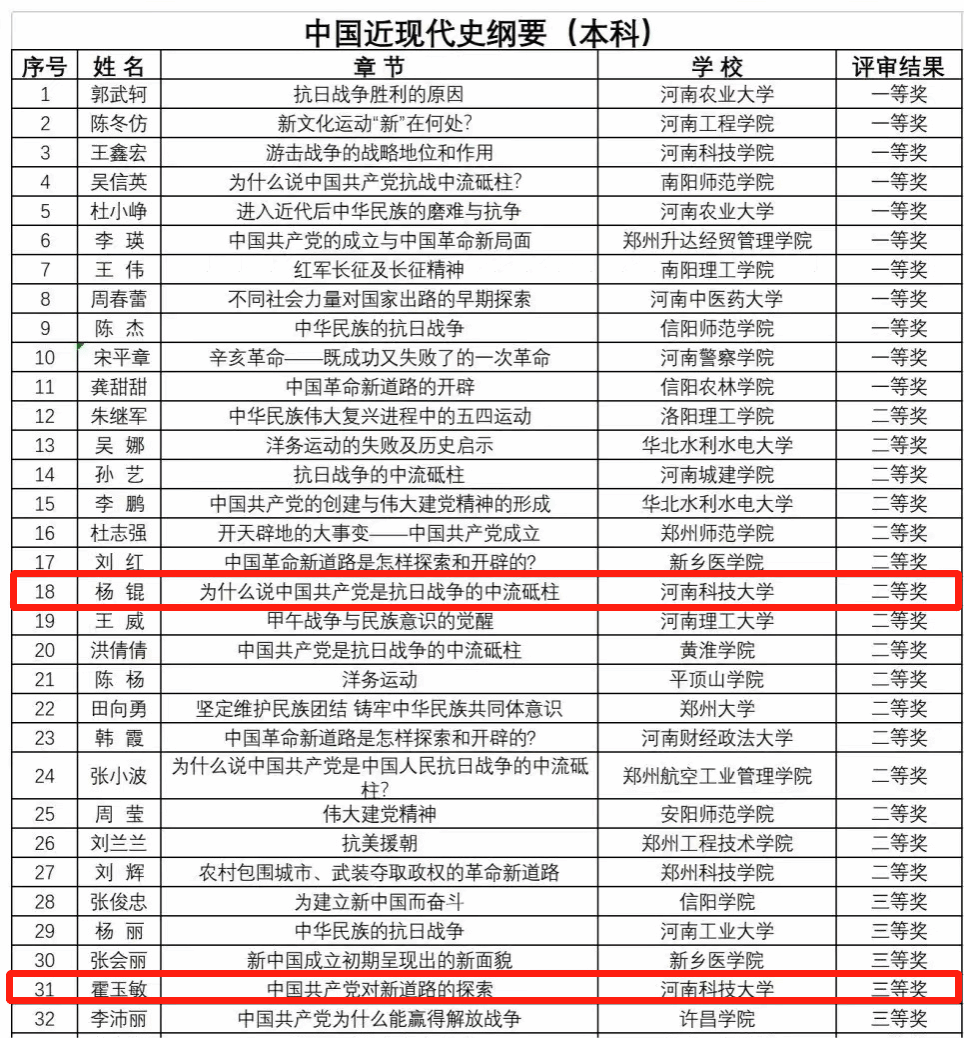 校新闻中心讯 近日,由中共河南省委教育工委办公室、河南省教育厅办公室下发的《关于全省高校思想政治理论课示范“金课”评审结果的公示》,公布了获奖名单,我校马克思主义学院推荐了九名教师,全部获奖。其中,谢向波、李翠翠荣获一等奖,张丽、杨锟荣获二等奖,刘晓丽、纪中强、霍玉敏、崔新生、徐晨晨荣获三等奖。