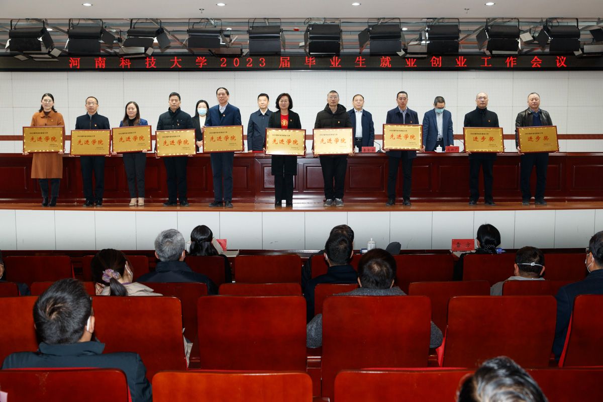 副校长庞新厂宣读《正规博彩平台关于表彰2022届毕业生就业工作先进学院、先进个人的决定》。大会对动物科技学院等10个就业工作先进学院和徐波波等44名就业工作先进个人进行表彰。农业装备工程学院党总支书记袁红建、食品与生物工程学院院长古绍彬、护理学院党委书记韩卫红、动物科技学院院长丁轲、体育学院党总支书记成法民先后作交流发言。