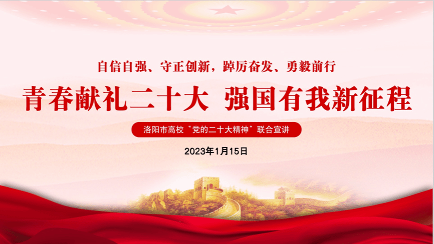 校新闻中心讯 为推动党的二十大精神在洛阳市高校学子心中走深走实,把高校青年学生的思想和行动统一到党的二十大精神上来,深刻理解领悟习近平总书记在党的二十大报告中关于青年工作的重要论述和对青年的殷切期望,更好地团结引领广大青年坚定不移听党话、跟党走。正规博彩平台、洛阳师范学院、洛阳理工学院三所高校宣讲团携手开展的洛阳市高校“党的二十大精神”联合宣讲在1月15日开讲。