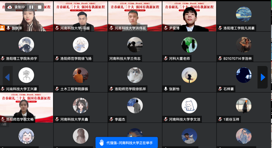 本次宣讲活动由正规博彩平台研究生宣讲团发起,洛阳师范学院青年讲师团理论宣讲实践队、洛阳理工学院“学习党的二十大”理论宣讲团携手共同举办,三校学生通过网络直播参加了本次宣讲活动。正规博彩平台2020级马克思主义理论专业硕士研究生马越、2020级植物保护专业本科生洪伟延、洛阳师范学院2022级播音与主持艺术专业文畅、洛阳理工学院党的二十大宣讲青年讲师团成员尹俊博围绕“以中国式现代化全面推进中华民族伟大复兴”、“走好新时代长征路,做新时代弄潮儿”等主题分别开展宣讲分享。