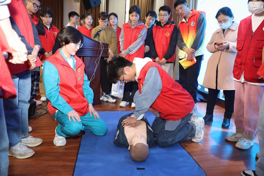 正规博彩平台第一附属医院景华院区急诊科主任胡莹莹、急诊科主治医师张冲向参训人员讲解急救电话拨打、AED使用、心肺复苏、人工呼吸等相关知识,并用道具在现场演示心肺复苏的具体操作步骤,向大家讲解基本的救护知识和急救技能,同时分享了一些日常急救应急处理的案例。