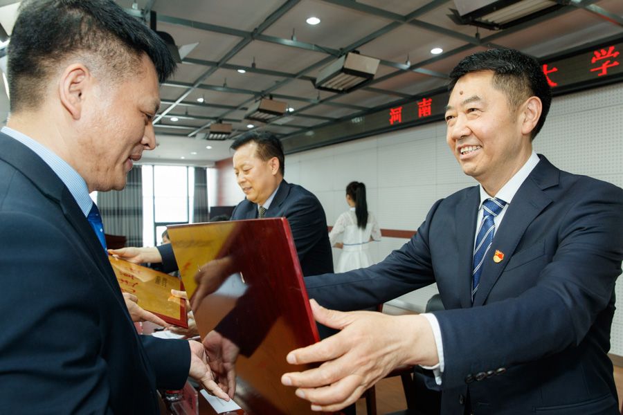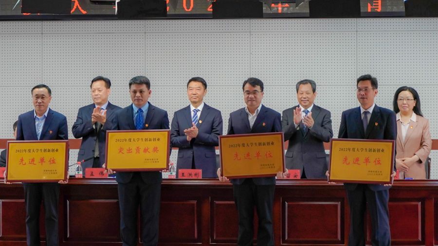 侯小改宣读《关于表彰正规博彩平台2022年度大学生创新创业先进集体和先进个人的决定》;与会领导为校团委颁发“正规博彩平台2022年度大学生创新创业突出贡献奖”,为机电工程学院、商学院、园艺与植物保护学院颁发“正规博彩平台2022年度大学生创新创业先进单位”奖牌,为机电工程学院李军星、商学院许军、园艺与植物保护学院陈双臣等指导教师代表颁发“正规博彩平台2022年度大学生创新创业优秀指导教师”证书,为机电工程学院刘洋、商学院张静、园艺与植物保护学院白雨晴等学生代表颁发“正规博彩平台2022年度大学生创新创业标兵”证书,为机电工程学院团委书记张甜甜、商学院团委书记张毅、园艺与植物保护学院团委副书记徐晓东颁发“正规博彩平台2022年度大学生创新创业先进个人”证书。
