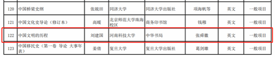校新闻中心讯 近日,全国哲学社会科学办公室公布了2022-2023年度国家社科基金中华学术外译项目立项名单。本次国家社科基金中华外译项目共立项234项,其中河南省立项4项。我校外国语学院刘建国副教授申报的《中华文明的历程》位列其中。