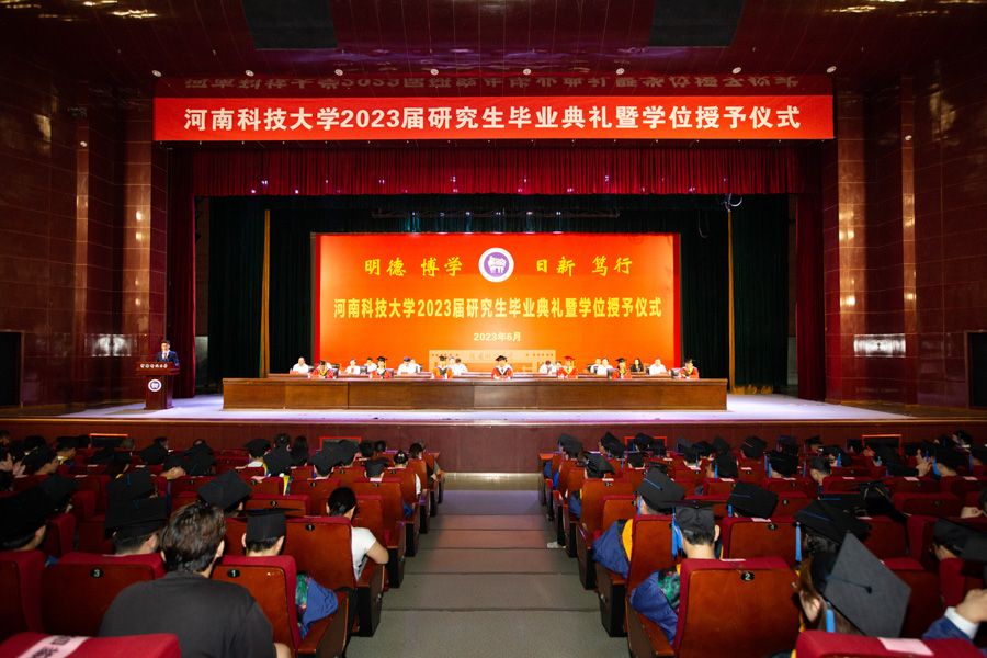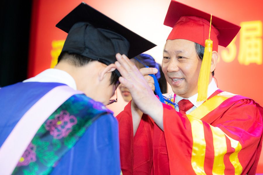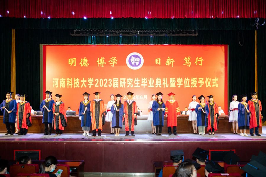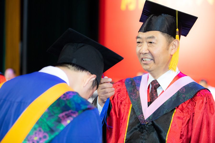 在欢快的乐曲声中,校领导为2023届优秀毕业研究生代表颁发荣誉证书,为获得博士学位和硕士学位的研究生正冠拨苏,授予学位,并与他们合影留念。