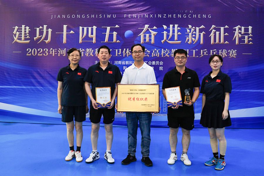 校新闻中心讯 6月8日至11日,由河南省教科文卫体工会主办、信阳师范学院承办的2023年河南省教科文卫体系统职工乒乓球比赛在信阳师范学院举行。我校体育学院董声老师荣获男子单打(中年组)冠军、基础医学与法医学院王勇老师荣获男子单打(青年组)第五名,我校荣获优秀组织奖。