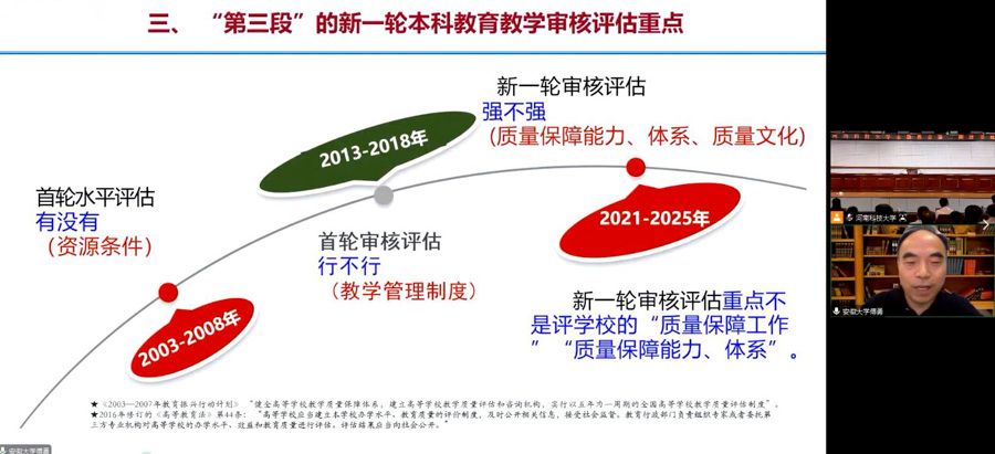 校新闻中心讯 7月5日下午,学校举办学习贯彻习近平新时代中国特色社会主义思想主题教育第二期读书班审核评估专题报告会。会议邀请安徽大学教学质量监控与评估处处长傅勇教授作主题为《把握B1方案及指标体系要点 以评促建 以评促改 以评促管 以评促强》的线上专题报告。全体在校校领导、中层干部、各学院审核评估资料梳理骨干成员参加学习。报告会由侯小改副校长主持。