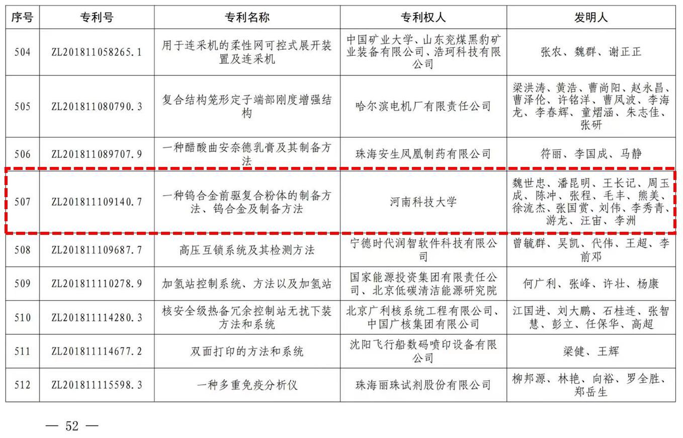 校新闻中心讯 7月19日国家知识产权局公布《国家知识产权局关于第二十四届中国专利奖授奖的决定》(国知发运字〔2023〕30号),我校魏世忠教授团队的专利“一种钨合金前驱复合粉体的制备方法、钨合金及制备方法(专利号:ZL201811109140.7)”荣获第二十四届中国专利奖优秀奖,这是学校知识产权工作布局、保护、运用、管理等方面持续发力,全力推进一流学科及高质量专利建设的成果。