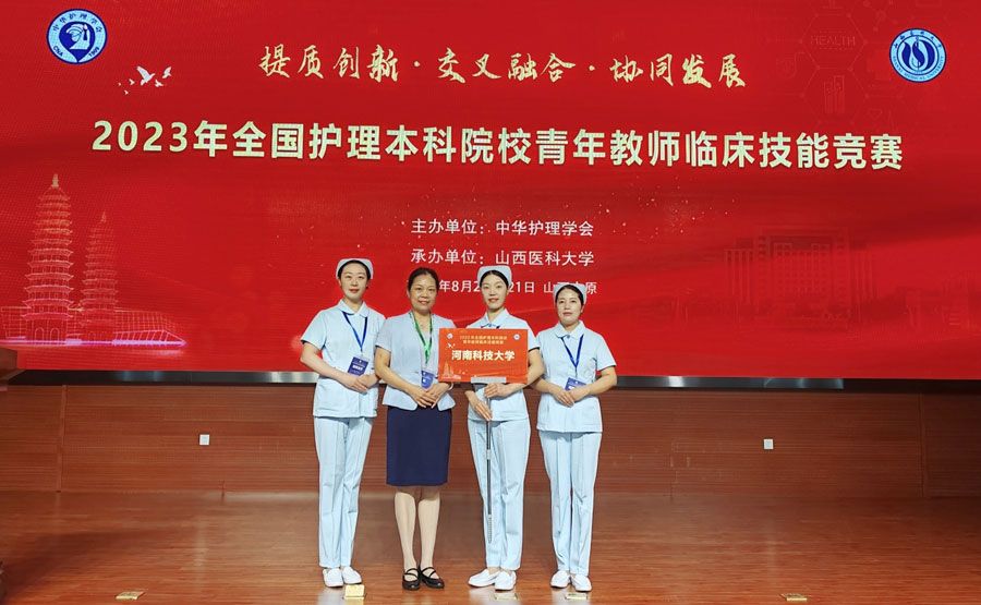 校新闻中心讯 8月21日,由中华护理学会主办的2023年全国护理本科院校青年教师临床技能竞赛在山西省太原市举行。我校护理学院青年教师刘宁、何静茹、张会杰参加比赛,荣获团体二等奖,刘宁荣获心肺复苏CPR个人奖第三名,张会杰荣获静脉输血个人奖第三名。