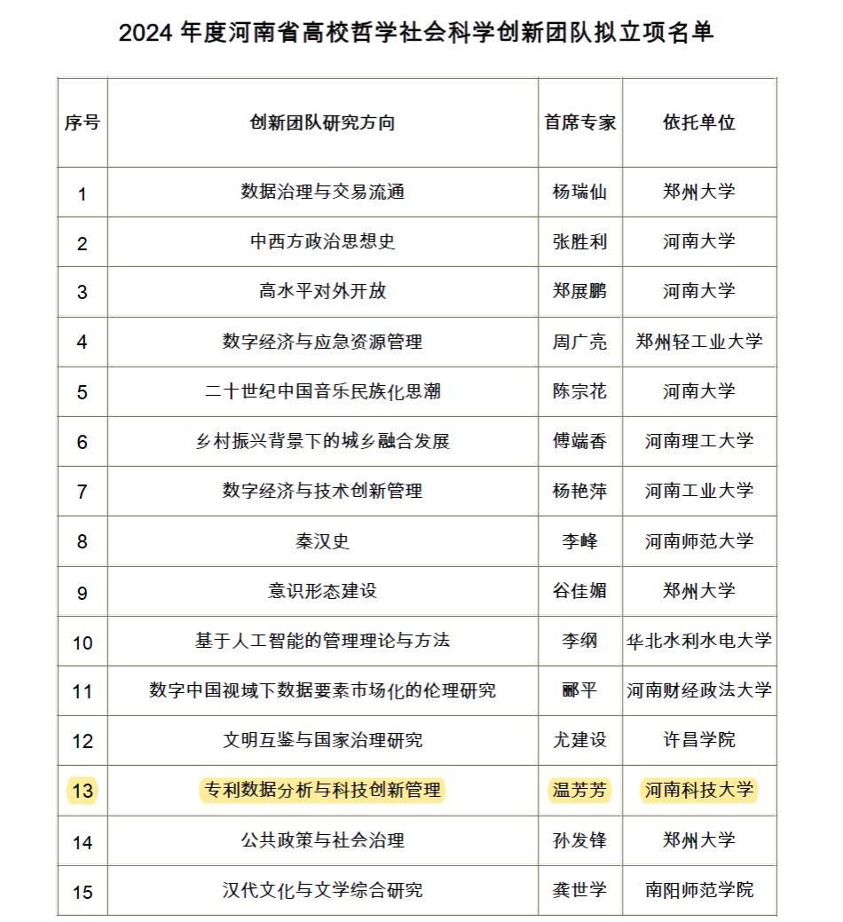 校新闻中心讯 近日,河南省教育厅公布了2024年度河南省高等学校哲学社会科学创新团队支持计划名单,全省高校共有15支团队入选,我校商学院温芳芳教授作为首席专家的“专利数据分析与科技创新管理”团队通过初评、答辩、会评环节后,获准立项。