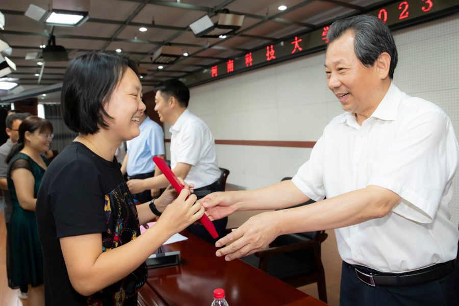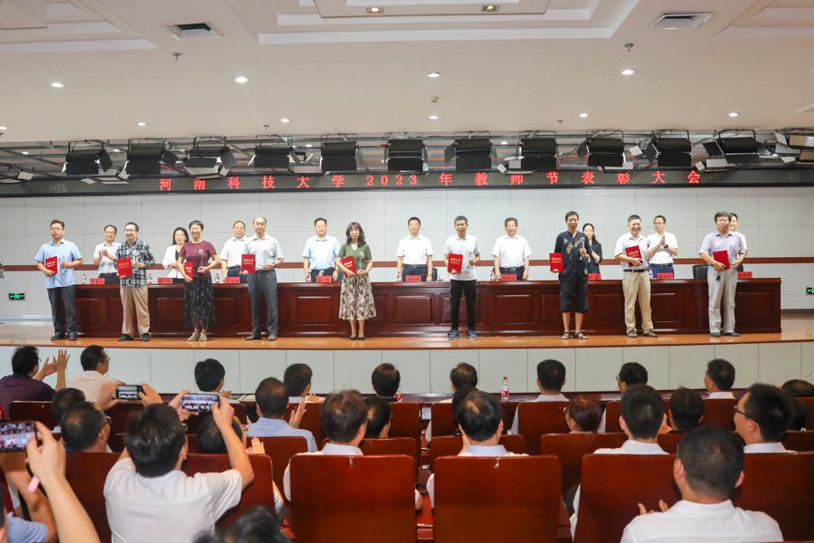 表彰会上,副校长李全安宣读先进集体、先进个人表彰决定;校党委书记王洪彬向国家级人才称号获得者王丹丹、金鑫、宋晓娜、冀保峰颁发绶带;校长孔留安向荣休教师代表孙艳红、上官宝、汤正新颁发证书和纪念章;全体校领导向教龄满三十年的教师代表、获得省部级以上荣誉称号的先进集体和先进个人代表及校级优秀教职工代表颁奖。