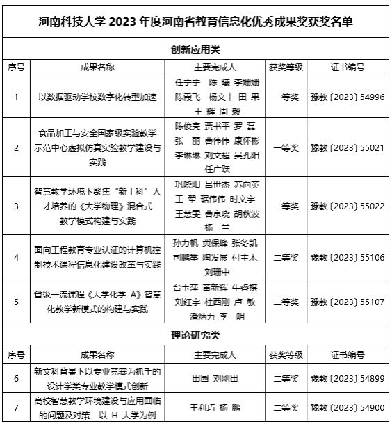 校新闻中心讯 日前,河南省教育厅下发《关于公布2023年度河南省教育信息化优秀成果获得名单的通知》,公布了2023年河南省教育信息化优秀成果奖获奖名单。我校共获奖7项成果奖获,其中创新应用类一等奖3项、二等奖2项,理论研究类二等奖2项。