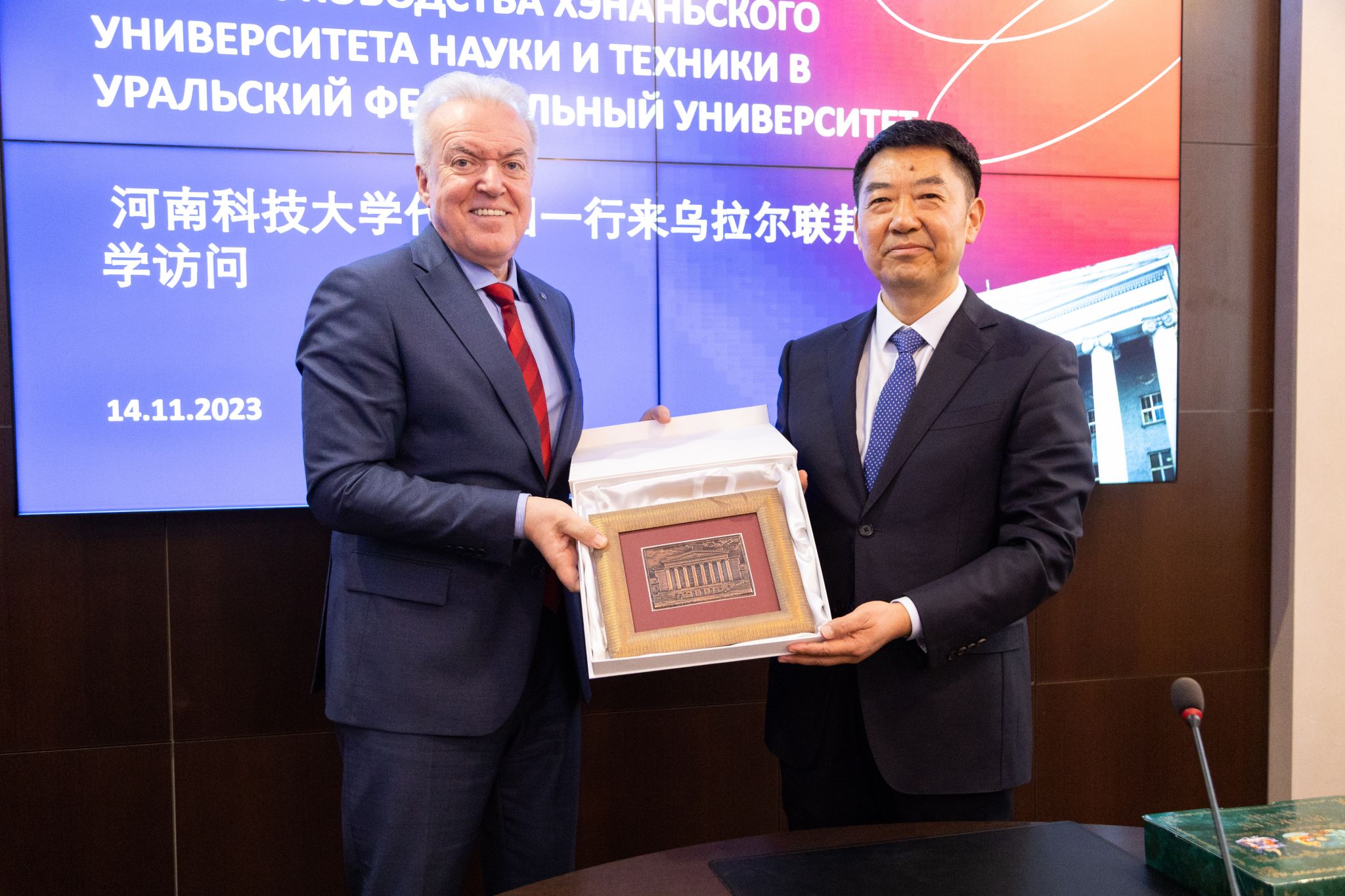 访问乌拉尔联邦大学期间,王洪彬与该校第一副校长布格罗夫•德米特里•维塔利耶维奇、第一副校长科尔托夫•谢尔盖•弗谢沃洛多维奇、学术副校长格尔曼年科•亚历山大•维克多罗维奇、国际关系副校长库兹明•伊利亚•瓦季莫维奇等人举行会谈。布格罗夫•德米特里•维塔利耶维奇代表乌拉尔联邦大学致欢迎辞,介绍了学校发展历程及人才培养的成效,重点交流了俄方对筹备设立洛阳乌拉尔大学所开展的工作以及下一步工作设想。王洪彬介绍了学校基本概况、专业特色、国际合作和人才培养情况,重点交流了洛阳乌拉尔大学筹建工作进展等情况。双方就共同加快推进申请洛阳乌拉尔大学筹备设立的相关事宜达成一致。会后,代表团参观了乌拉尔联邦大学化学制药技术创新中心和实验生产联合企业。