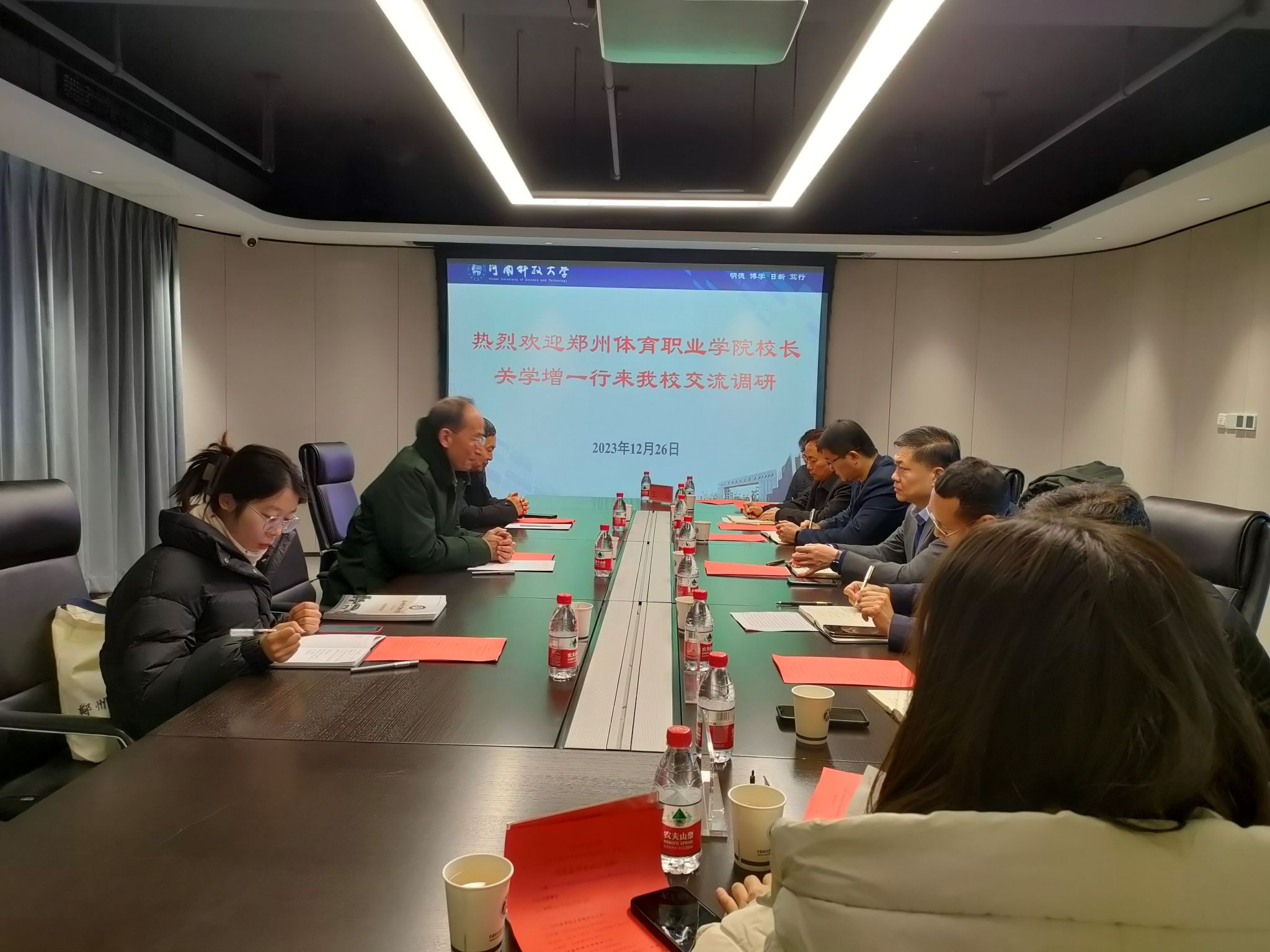 校新闻中心讯 12月26日上午,郑州体育职业学院校长关学增来校交流调研。交流座谈会在文科一号楼701会议室举行。副校长王学峰出席会议,食品与生物工程学院、商学院负责人参加会议。