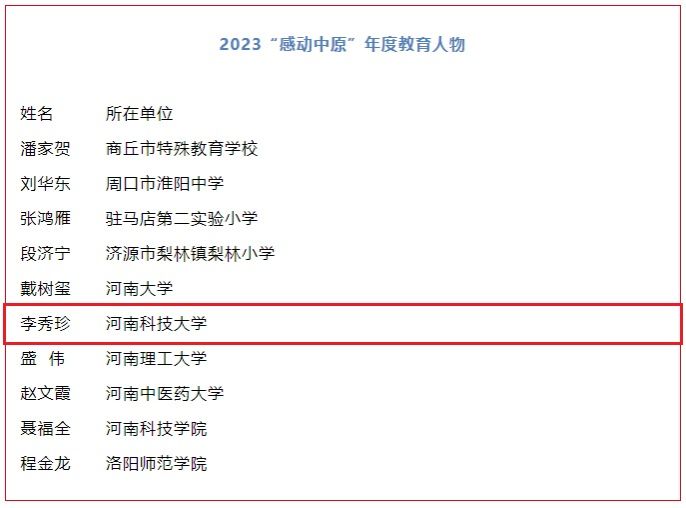 校新闻中心讯 近日,中共河南省委教育工委、河南省教育厅评选出了2023“感动中原”年度教育人物10人。其中,我校园艺与植物保护学院李秀珍副教授获此殊荣。