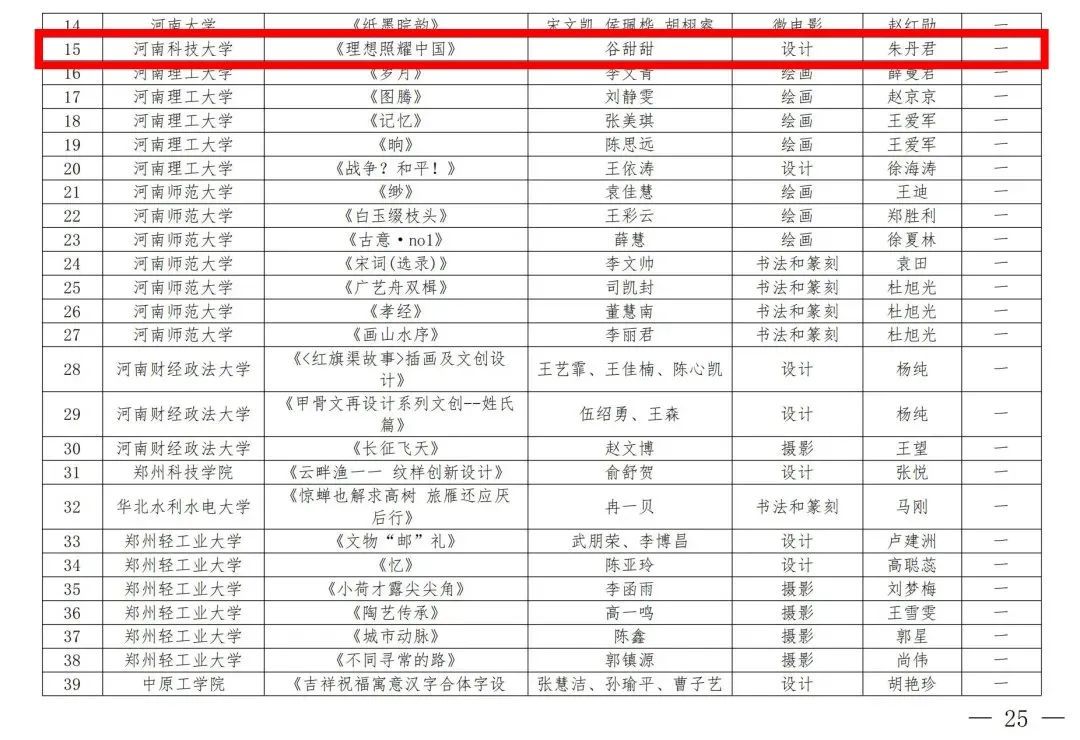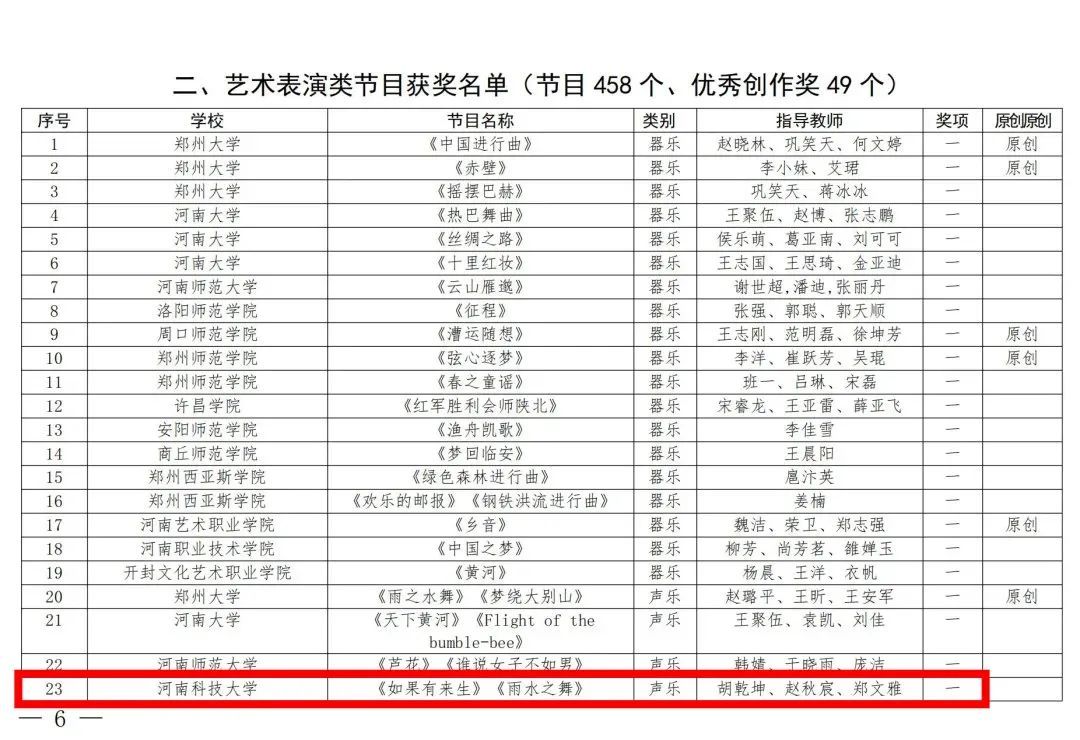 校新闻中心讯 近日,由河南省教育厅主办的河南省第七届大学生艺术展演活动落下帷幕。我校艺术与设计学院师生在艺术表演、艺术作品、高校美育改革创新优秀案例三类比赛中共取得一等奖两项、二等奖四项、三等奖两项的好成绩。