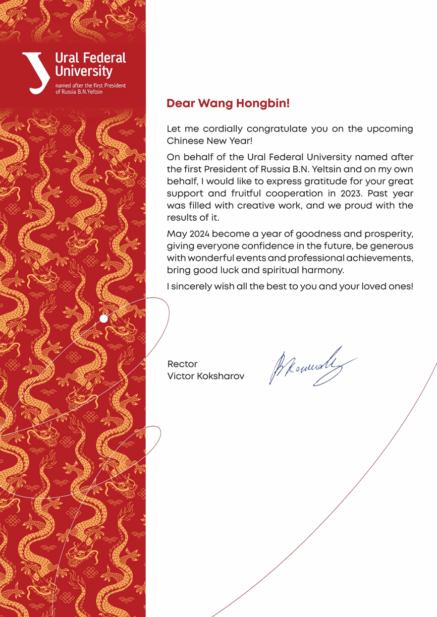 校新闻中心讯 在农历甲辰龙年即将到来之际,俄罗斯乌拉尔联邦大学校长维克多·阿纳托利耶维奇·科克沙罗夫向我校发来春节贺电,祝福我校全体师生新年快乐!