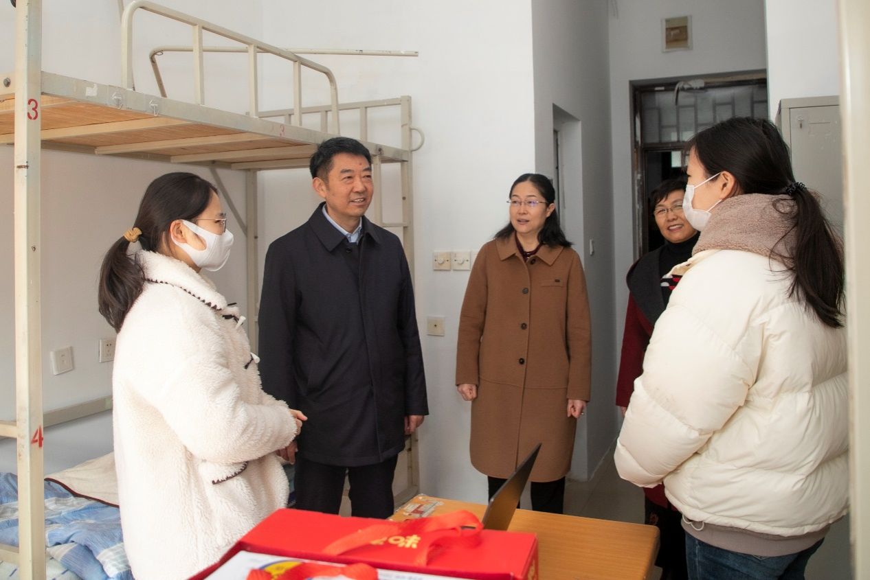 在菁园学生公寓,王洪彬一行看望留校学生,了解学生在学习、住宿、用餐等方面的情况,叮嘱同学们安排好留校期间的学习和生活,劳逸结合,度过一个欢乐充实有意义的新春佳节。