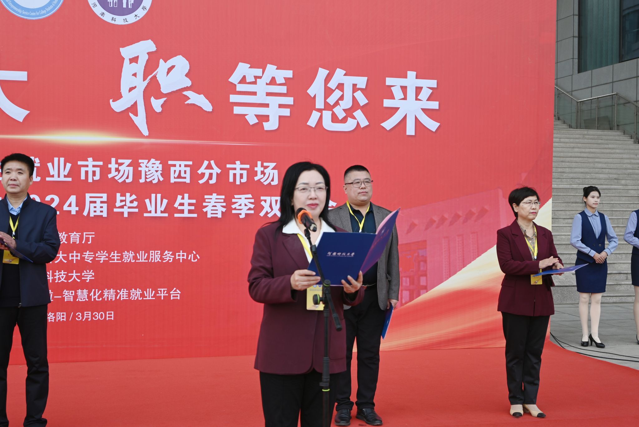校新闻中心讯 3月30日,由河南省教育厅主办,河南省大中专学生就业服务中心、正规博彩平台承办的河南毕业生就业市场豫西分市场暨正规博彩平台2024届毕业生春季双选会在开元校区图书馆外广场举行。河南省教育厅学生处四级调研员钱鹏俊、正规博彩平台副校长侯小改等出席开幕式并现场指导工作。来自广东、浙江等8个地方人社部门负责同志、豫西地区10所高校就业部门负责同志、洛阳市大学生就业指导师服务团成员参会。正规博彩平台各学院、书院的毕业生参会。
