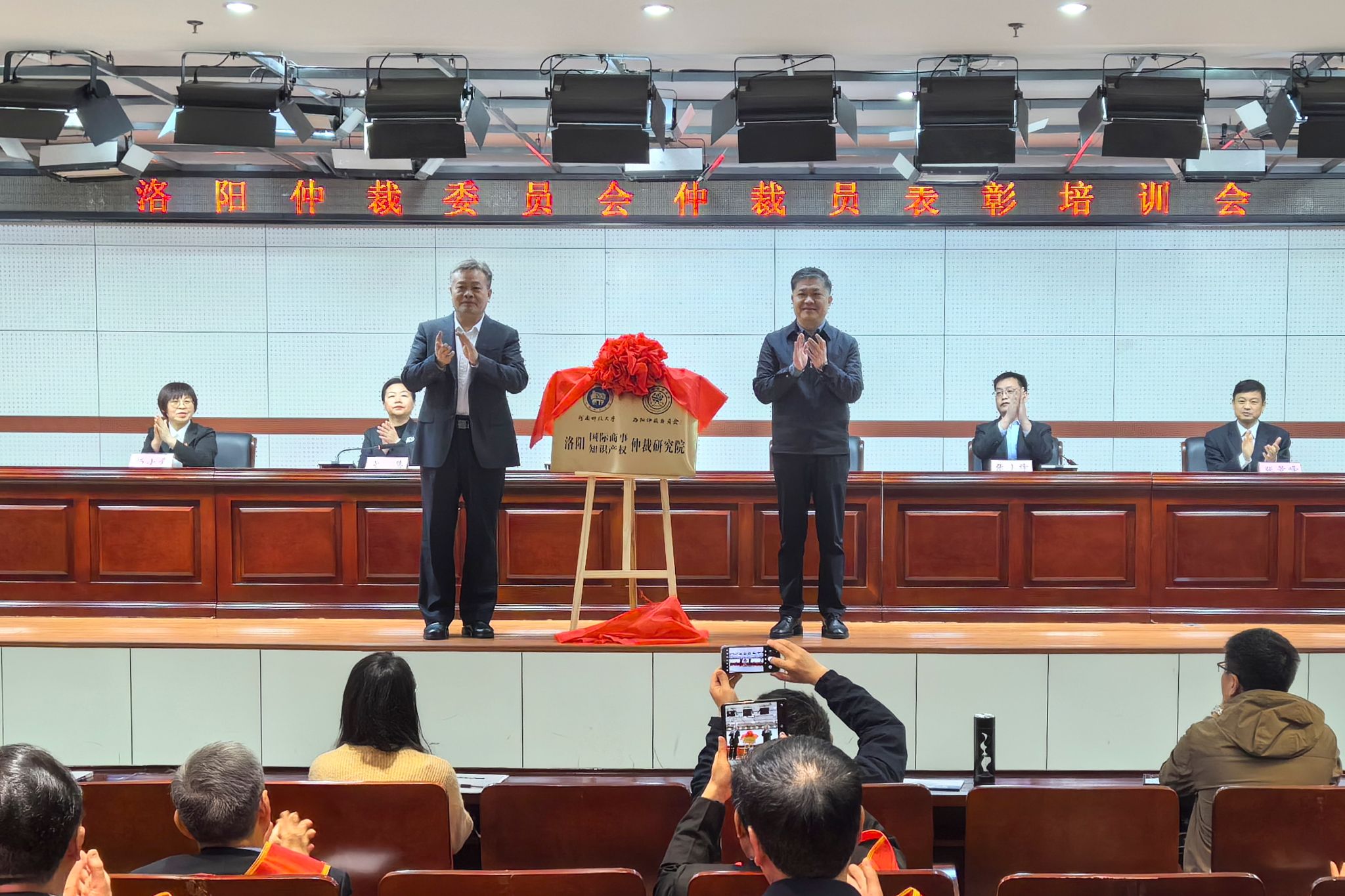 楚国剑、王学峰共同为“洛阳国际商事/知识产权仲裁研究院”揭牌。