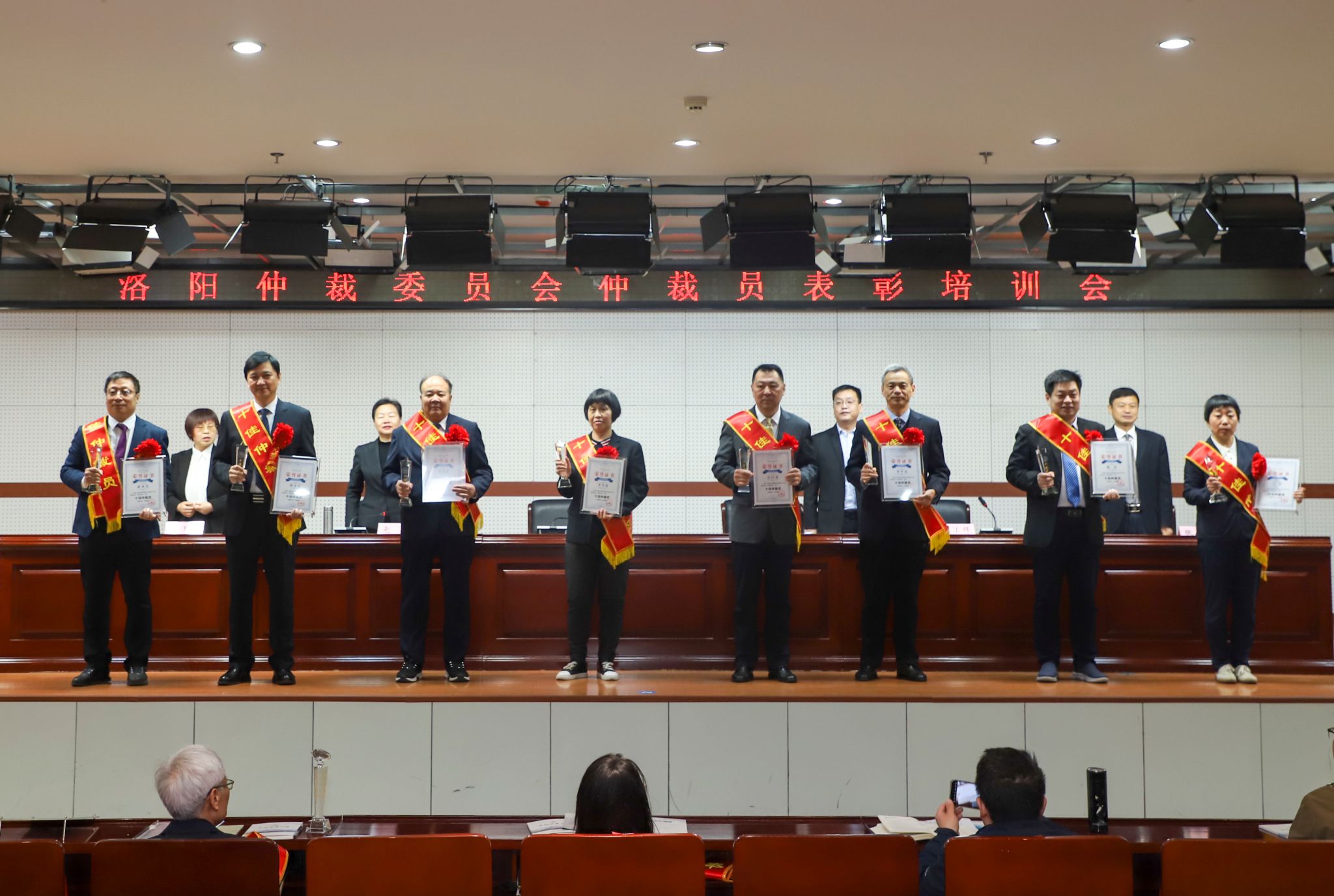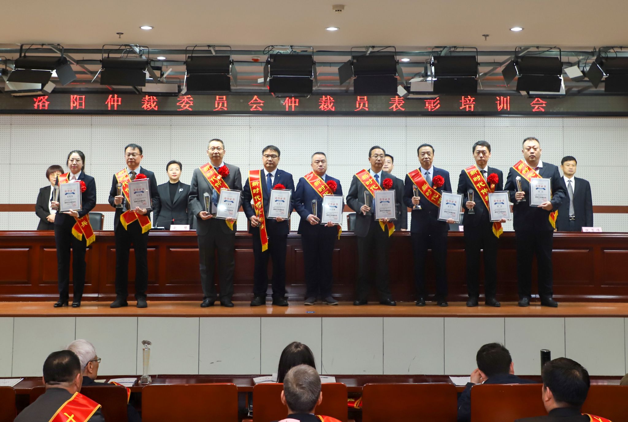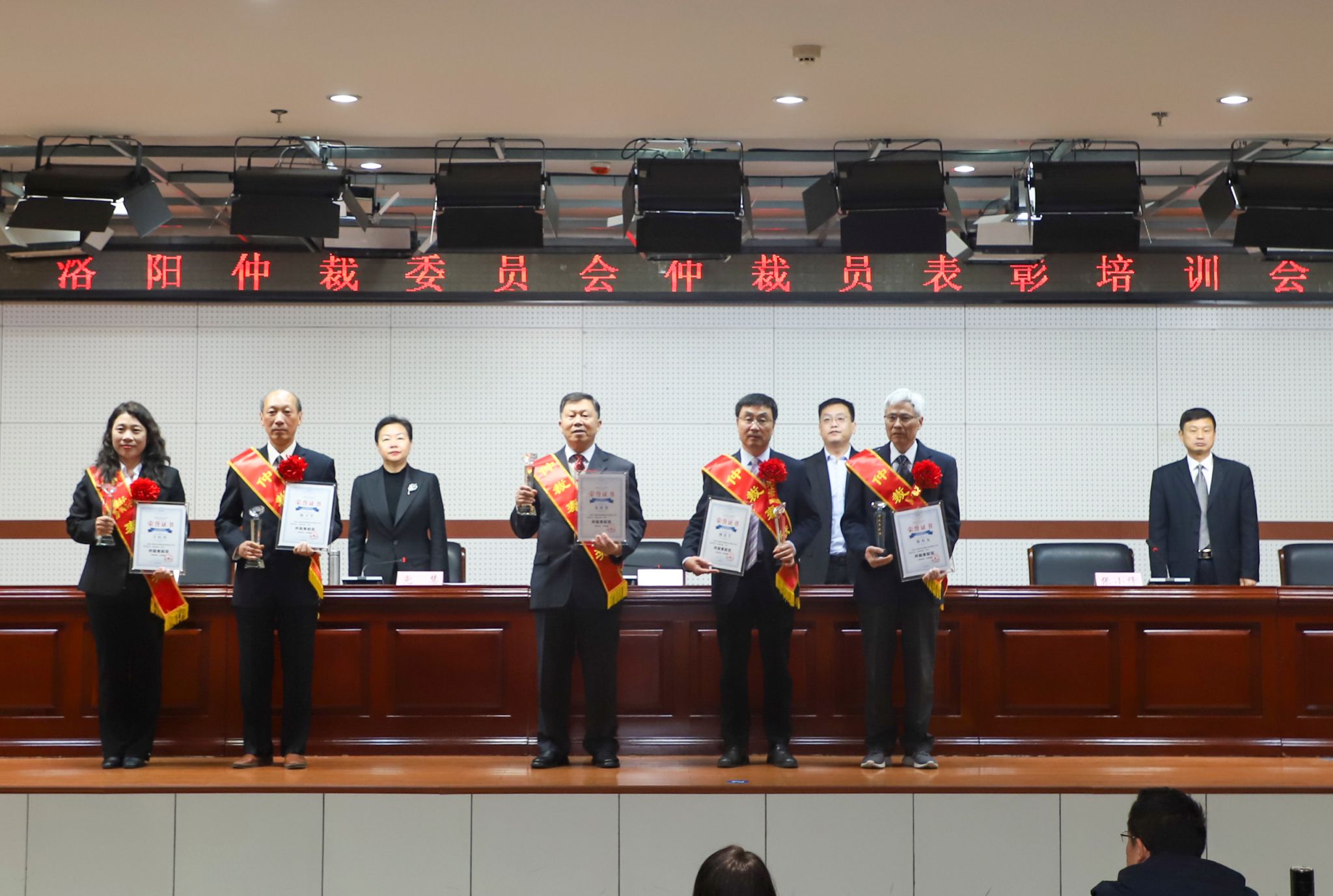 张小锋宣读洛阳仲裁委员会优秀仲裁员的表彰决定。我校张景峰获十佳仲裁员荣誉称号;杨连专获仲裁奉献奖;崔自力、黄权伟、王黎明获新时代仲裁标兵荣誉称号,占表彰人数六分之一。第三届新聘仲裁员代表向洛阳仲裁委员会递交仲裁员承诺书并领取聘书。