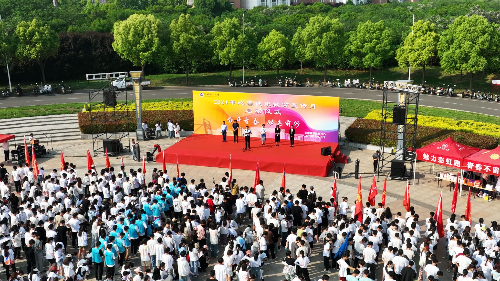 本届“奋斗青春,励志前行”心理健康教育宣传月活动时间为4月27日至5月31日,包含启动仪式、彩虹跑、心理情景剧大赛、心理专题讲座、“微幸福”打卡、朋辈心理品茶会、素质拓展训练、心理书籍阅读等活动。