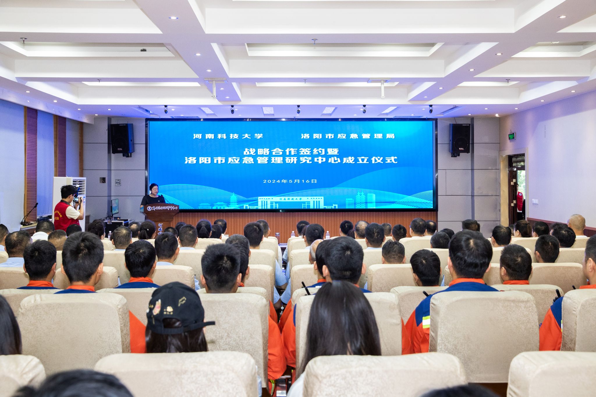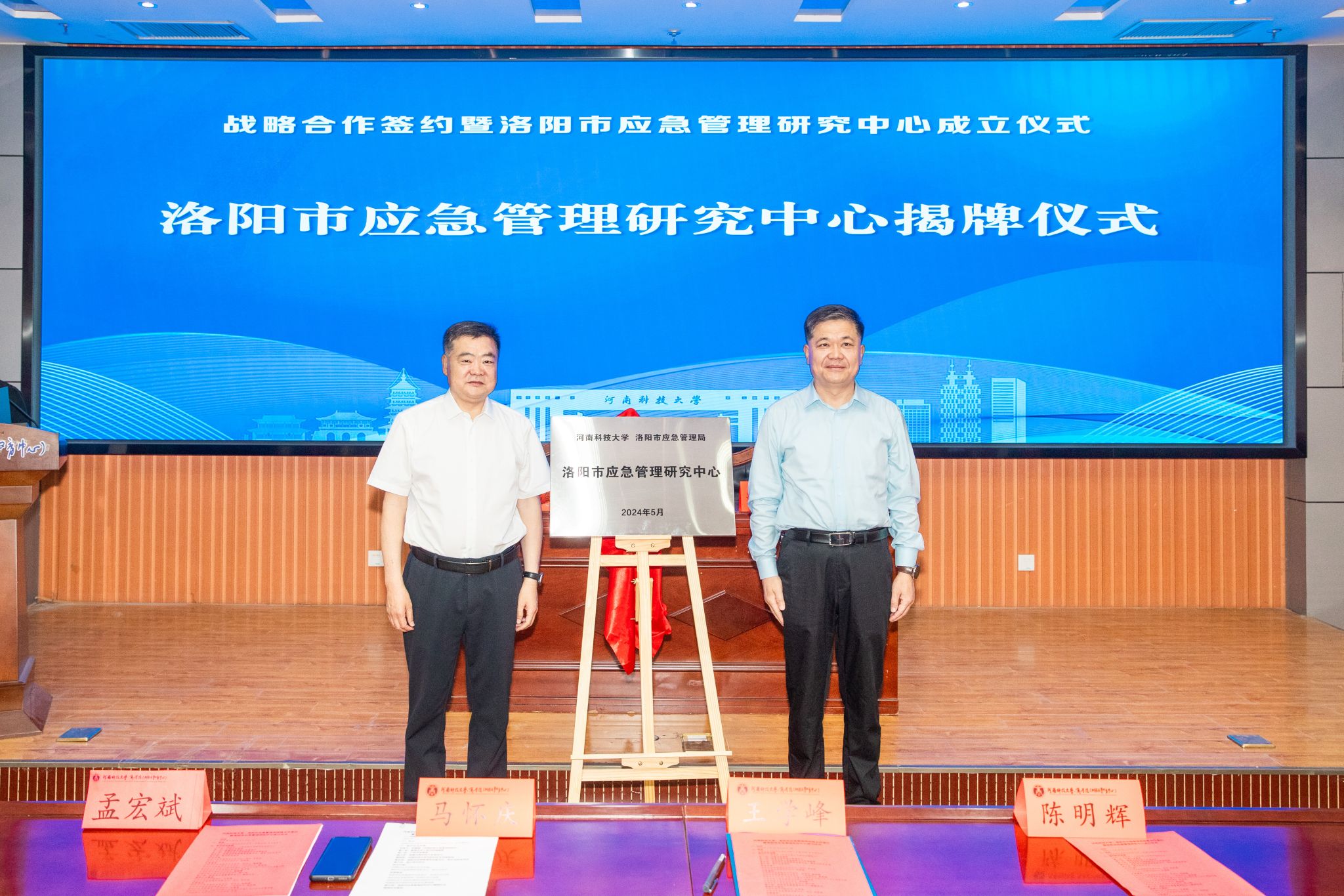 校新闻中心讯 5月16日,我校与洛阳市应急管理局共同组建的“洛阳市应急管理研究中心”揭牌仪式在我校开元校区文1-S105学术报告厅举行。副校长王学峰,洛阳市应急管理局党委书记、局长马怀庆,副局长陈明辉,人保财险公司洛阳分公司总经理华伟,洛阳市人大代表张巧丽参加仪式。
