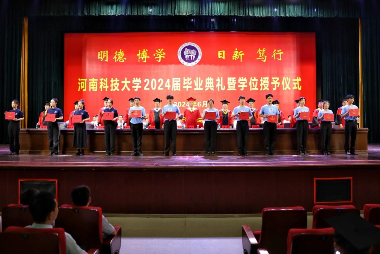 校领导为2024届优秀毕业生代表颁发荣誉证书,为毕业生代表颁发毕业证书、正冠拨苏、授予学位,并合影留念。