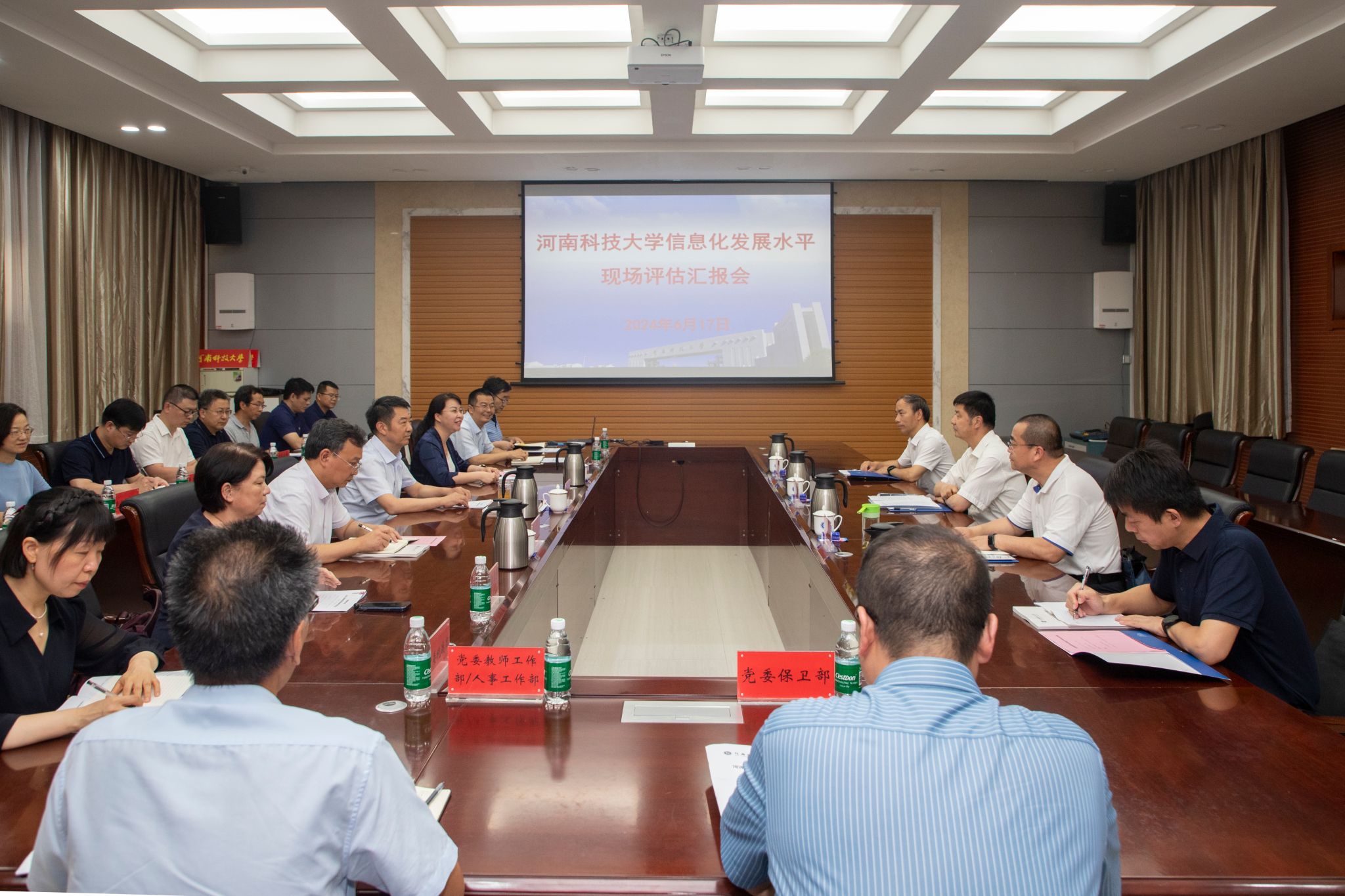 校新闻中心讯 6月17日,河南省本科高校信息化发展水平评估第二评估组来我校检查指导学校信息化工作。党委书记、校长王洪彬,党委副书记海然,副校长穆云超,学校网络安全和信息化委员会委员单位和相关单位负责人参加评估活动。
